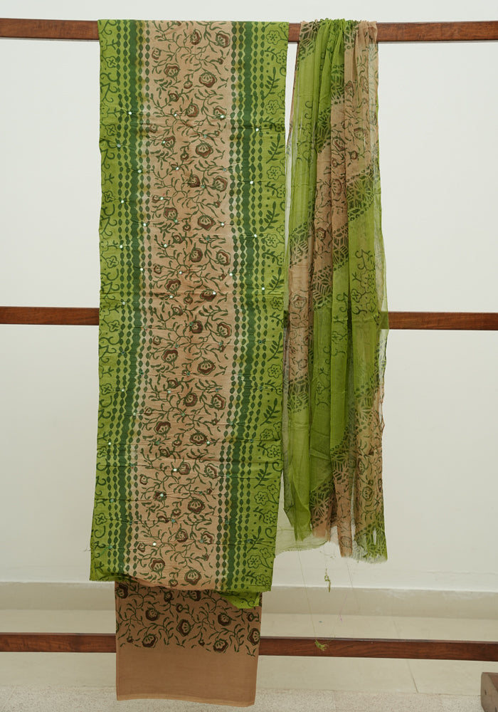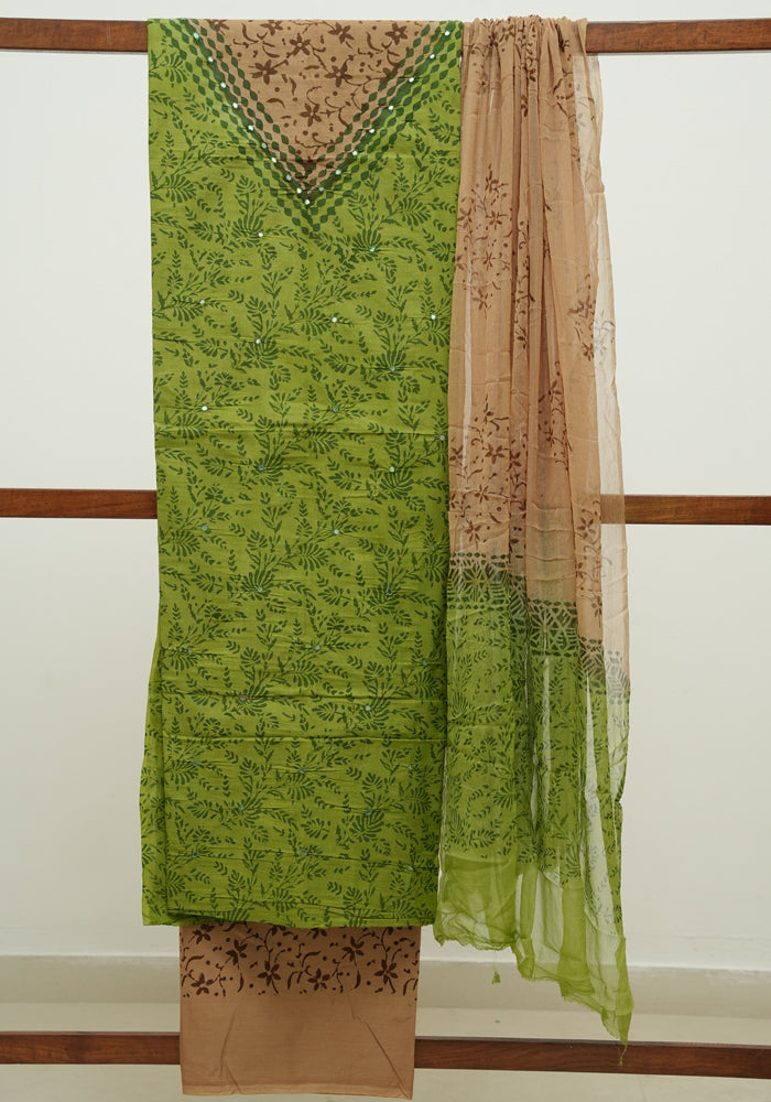 Light Brown and Green Unstitched Cotton Salwar Set With Mirror Work