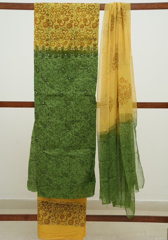 Green and Yellow Unstitched Cotton Salwar Set With Mirror Work