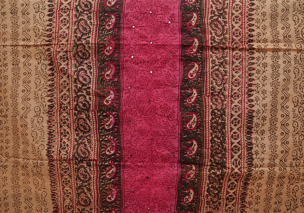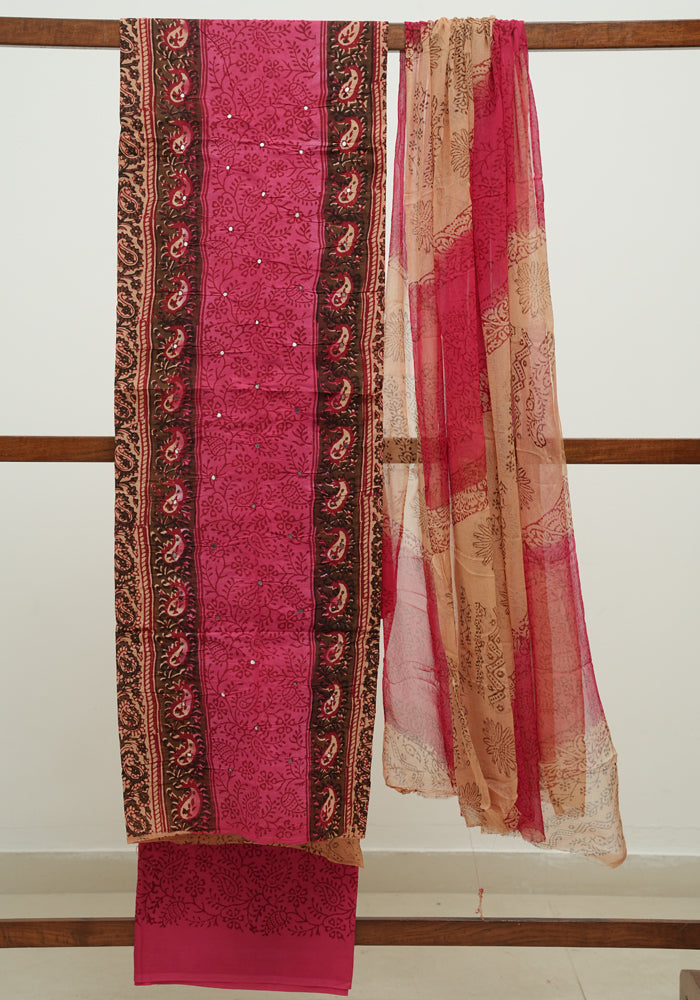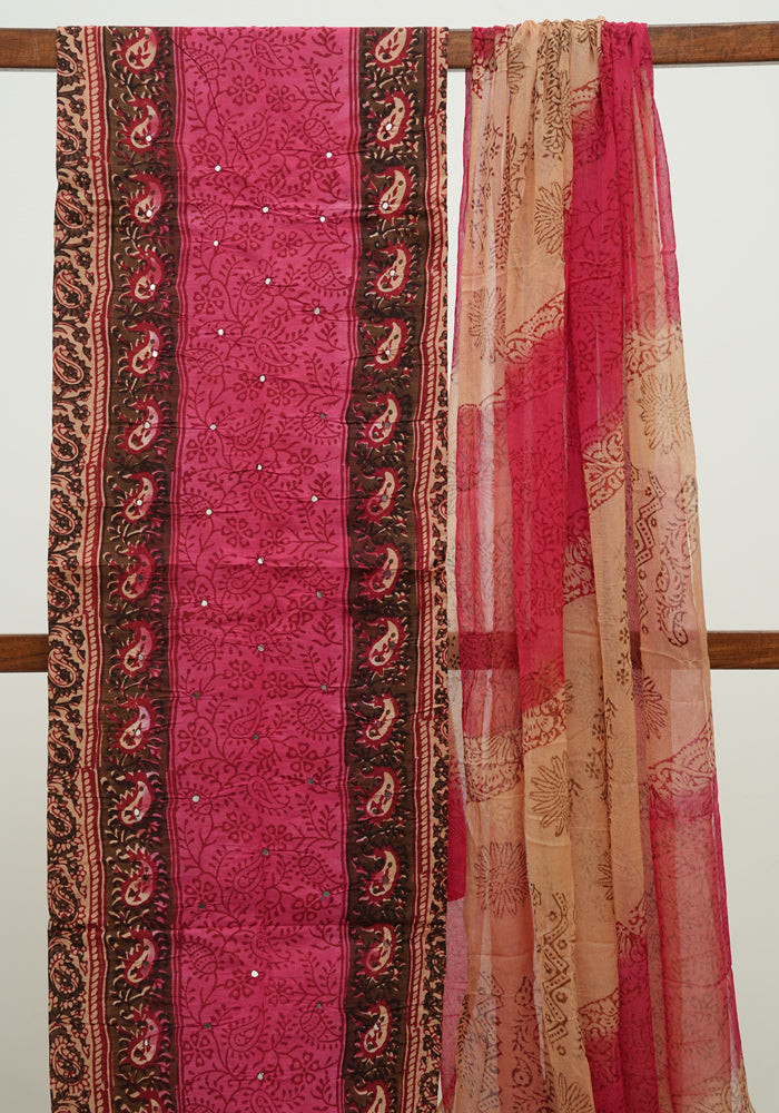 Light Brown and Magenta Unstitched Cotton Salwar Set With Mirror Work