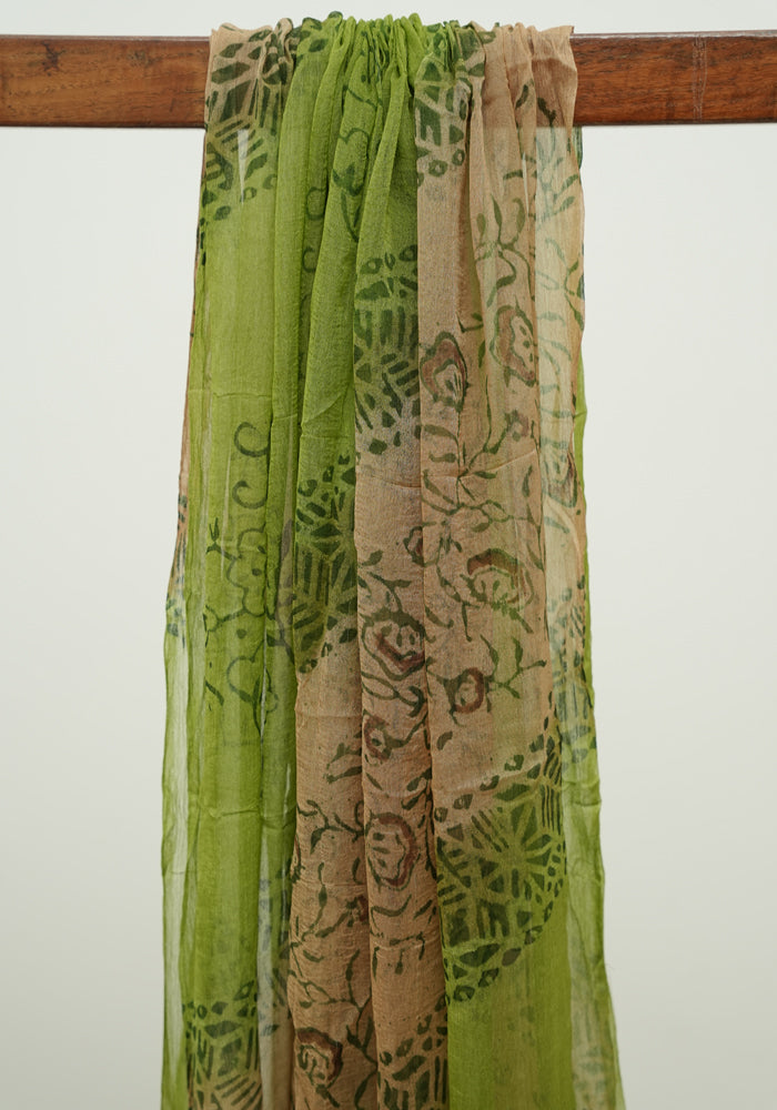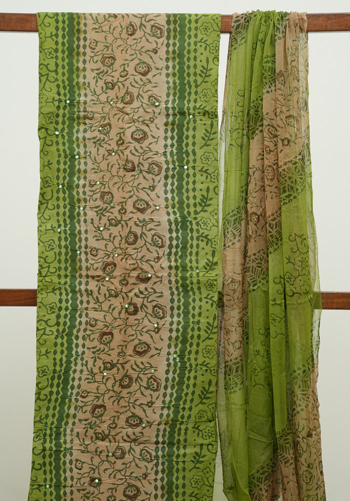 Mehandi Green and Light Brown Unstitched Cotton Salwar Set With Mirror Work