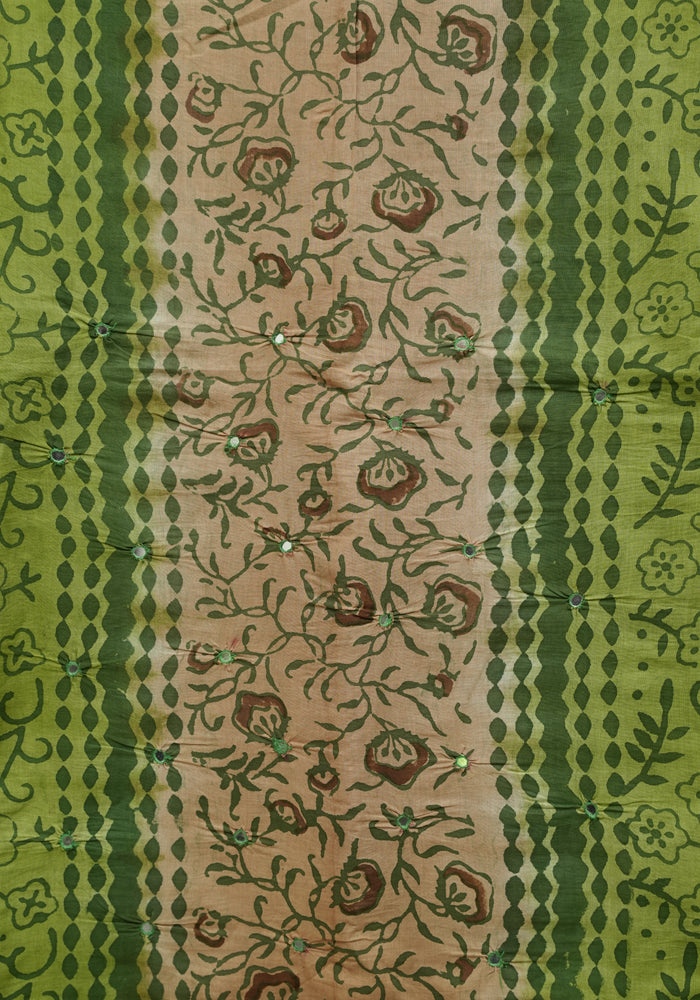 Mehandi Green and Light Brown Unstitched Cotton Salwar Set With Mirror Work is OUT OF STOCK currently and available on pre-payment only. Order now for delivery within 2 weeks.