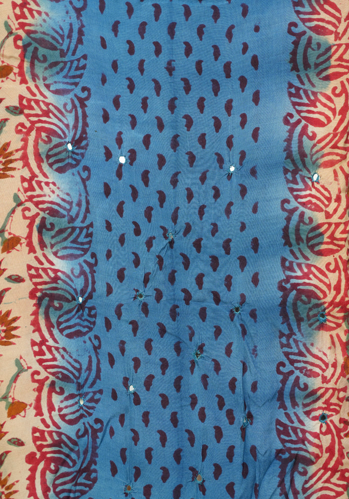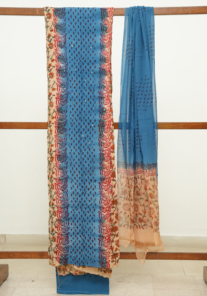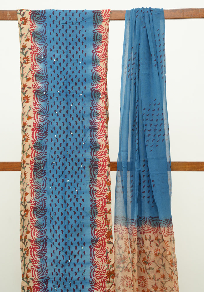Light Brown and Blue Unstitched Kalamkari Block Printed Muslin Salwar Set with Mirror Work