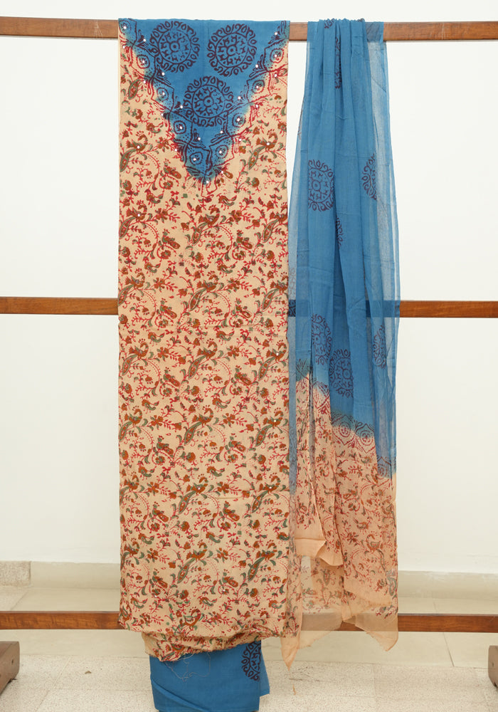Light Brown and Blue Unstitched Kalamkari Block Printed Muslin Salwar Set with Mirror Work