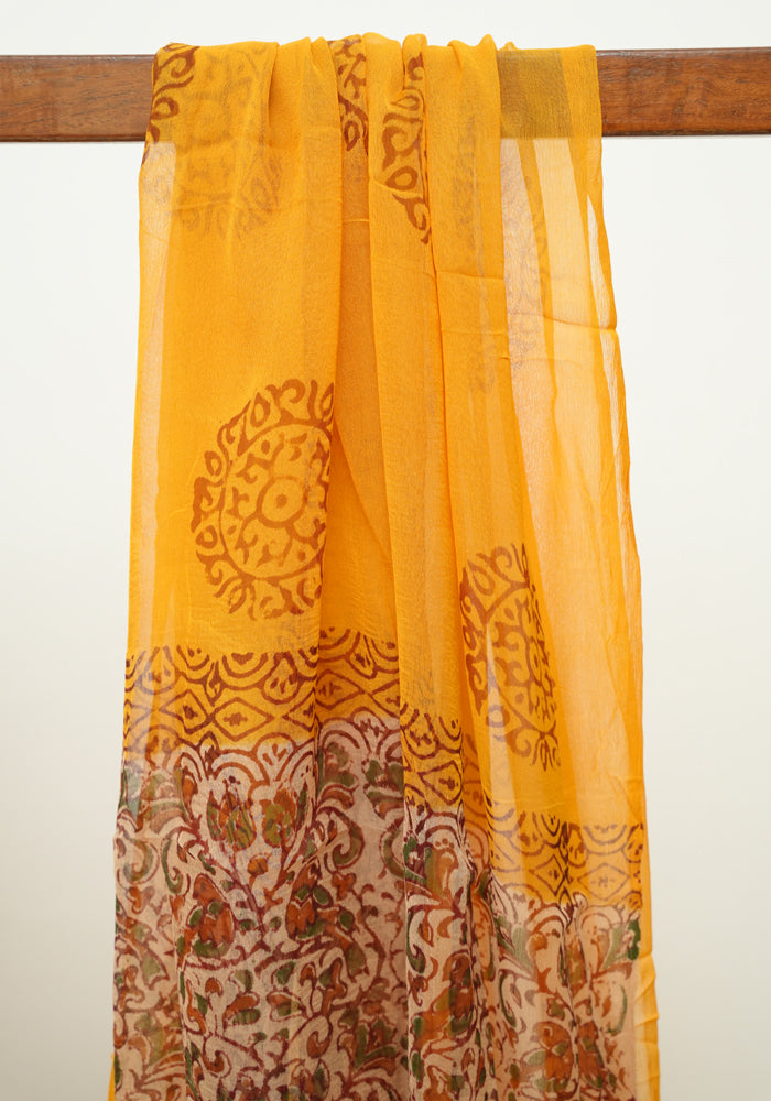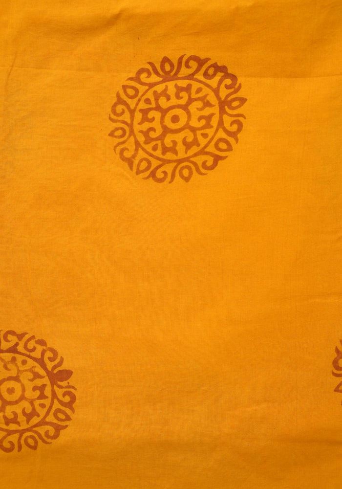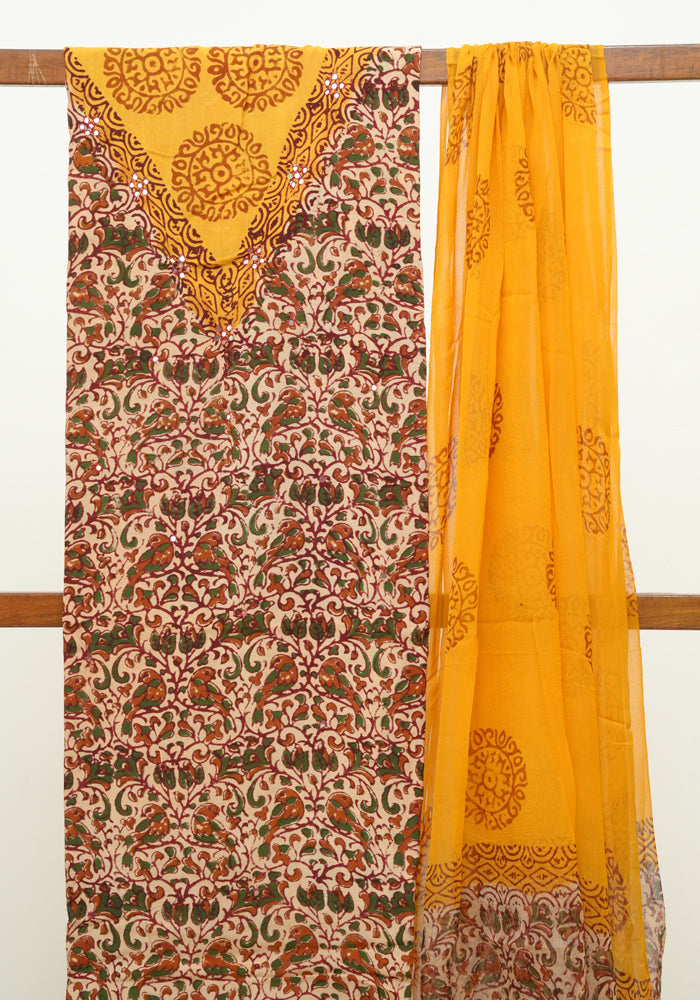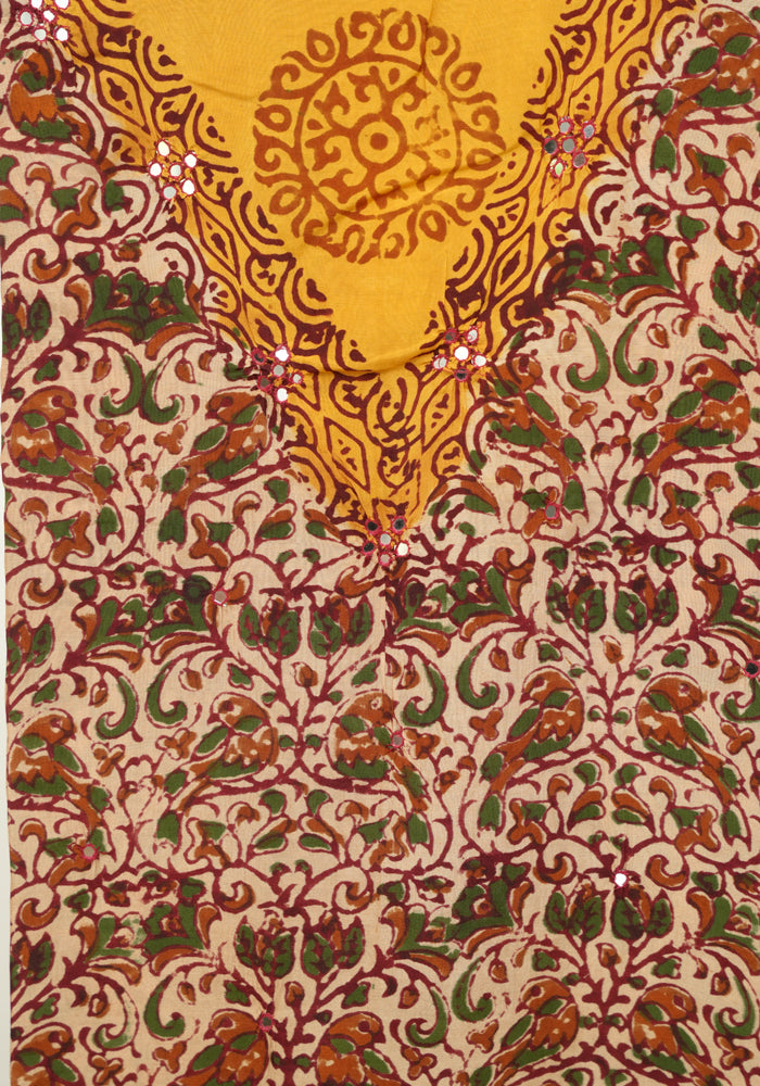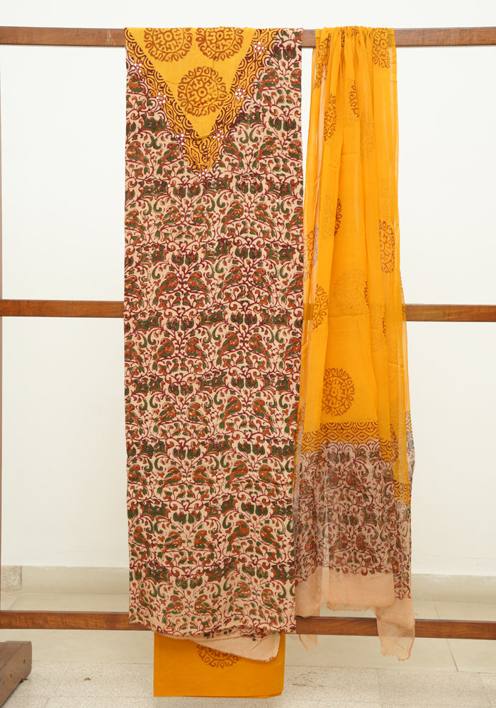 Light Brown and Mango Yellow Unstitched Kalamkari Block Printed Muslin Salwar Set with Mirror Work