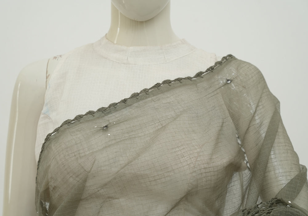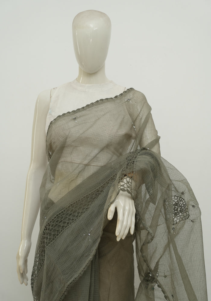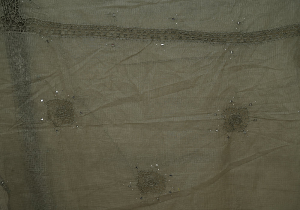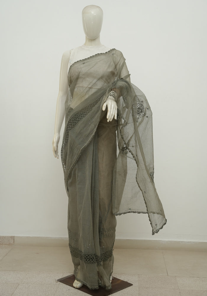 Greenish Grey Kota Saree With Mirror and Crochet Work