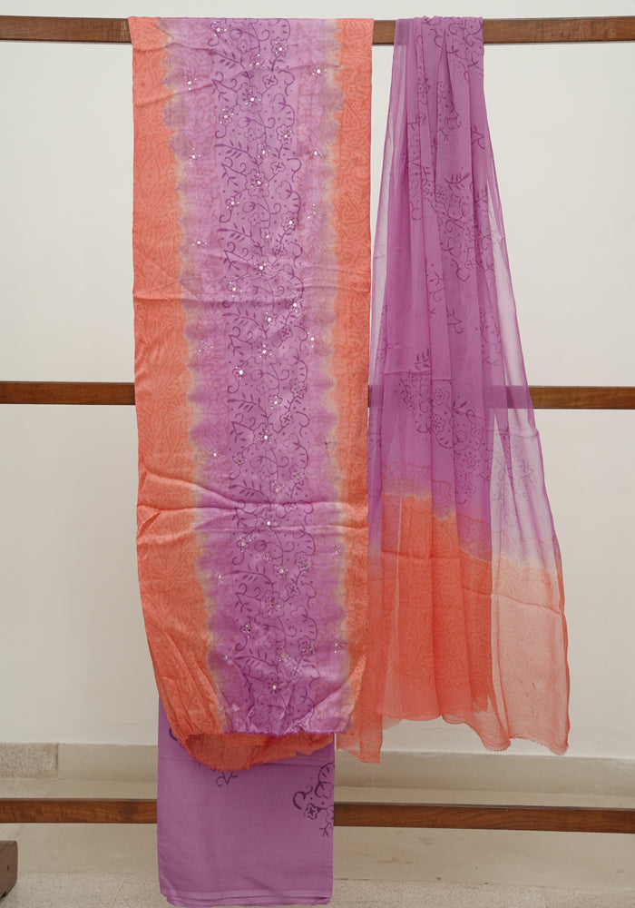 Peach and Purple Modal Silk Block Printed Unstitched Salwar Set With Mirror and Badla Work