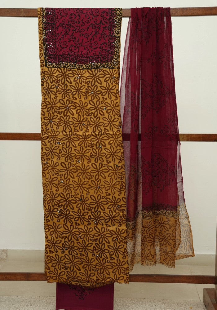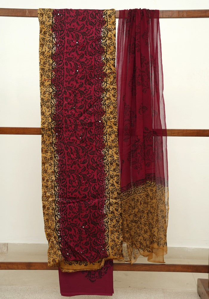 Light Brown and Jamun Red Modal Block Printed Unstitched Salwar Set With Mirror and Badla Work