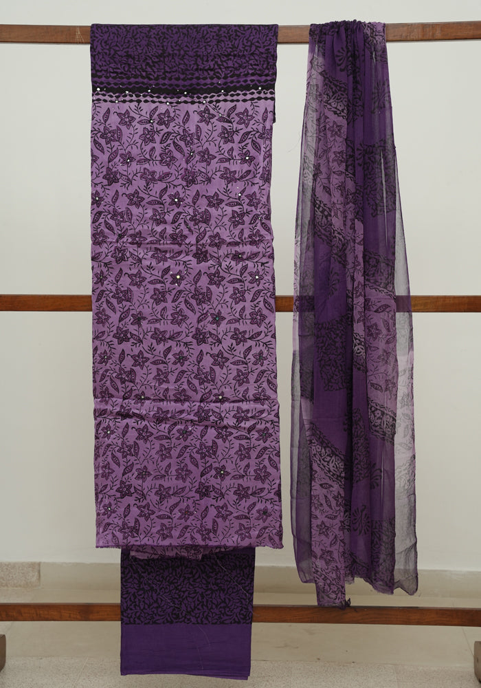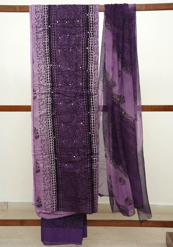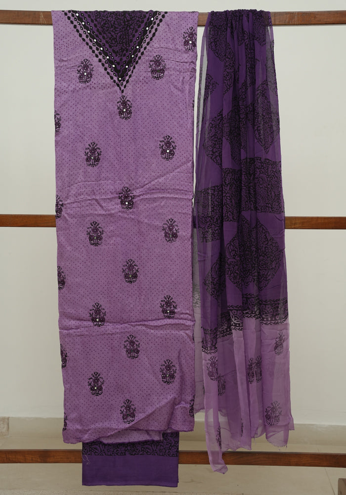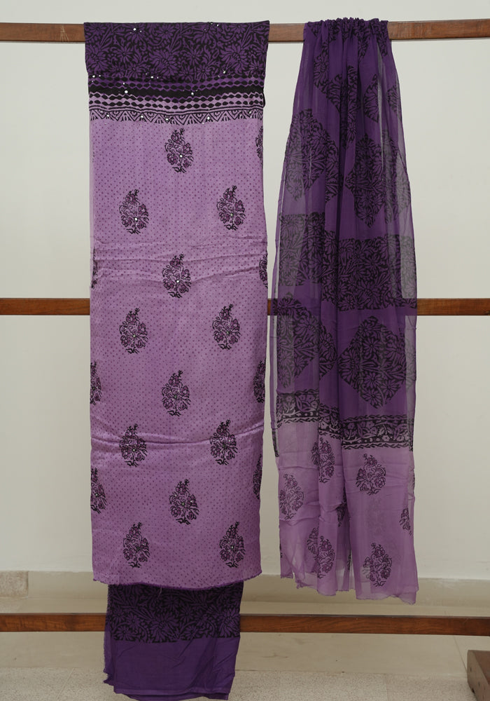 Light Purple and Dark Purple Modal Silk Block Printed Unstitched Salwar Set With Mirror and Badla Work