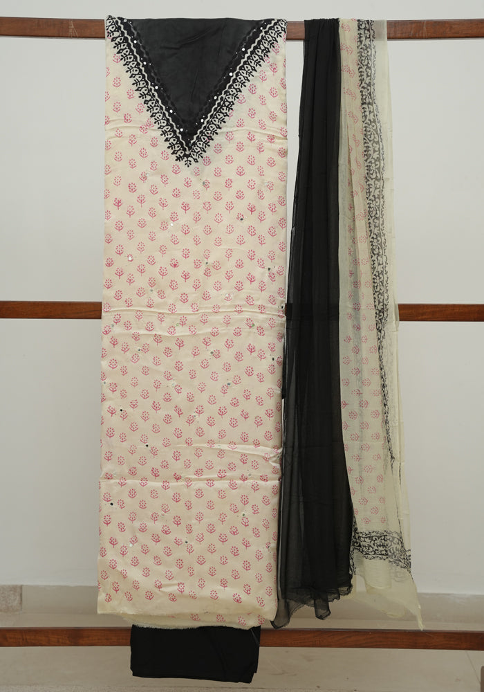 Off White and Black Modal Silk Block Printed Unstitched Salwar Set With Mirror and Badla Work
