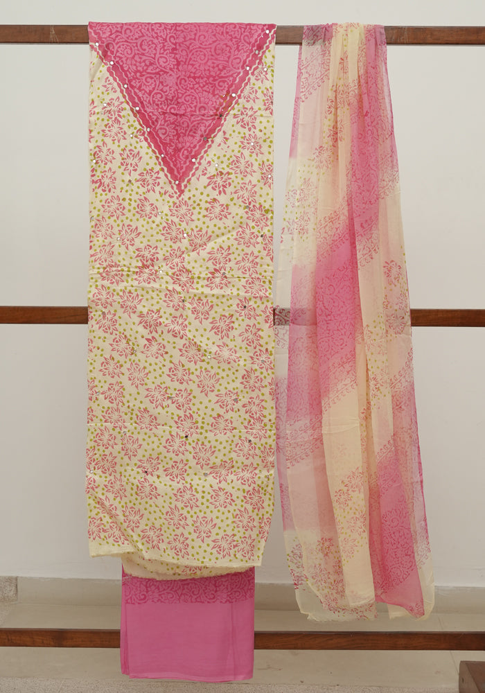 Off White and Pink Modal Silk Block Printed Unstitched Salwar Set With Mirror and Badla Work