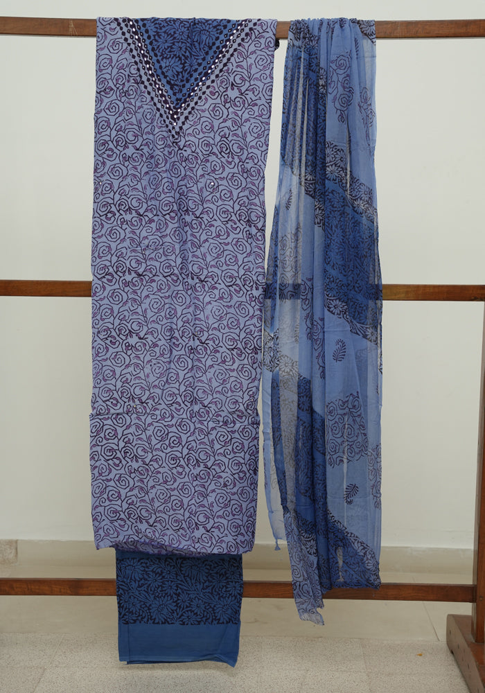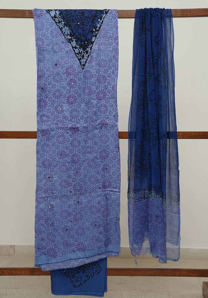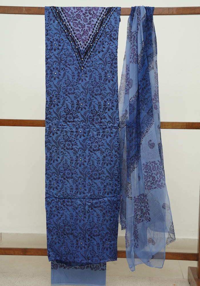 Blue and Cobalt Blue Modal Block Printed Unstitched Salwar Set With Mirror and Badla Work
