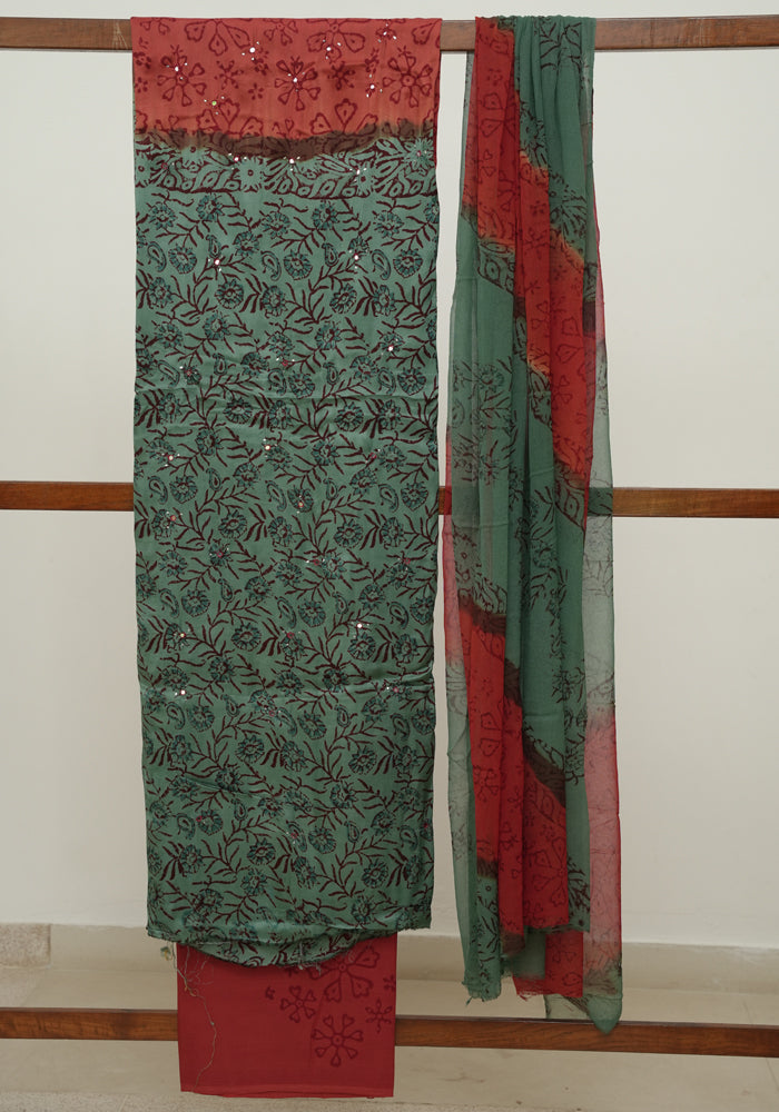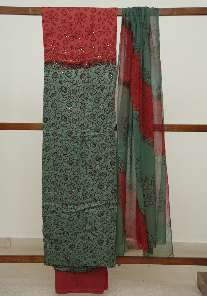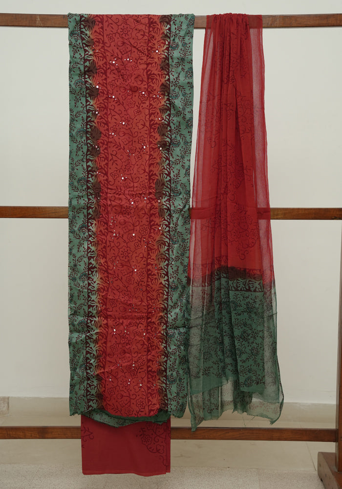 Teal Green and Rust Red Modal Block Printed Unstitched Salwar Set With Mirror and Badla Work