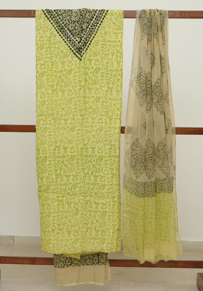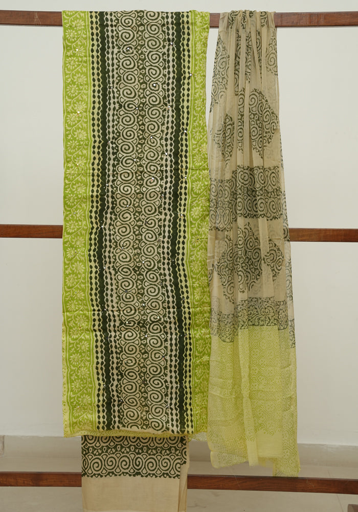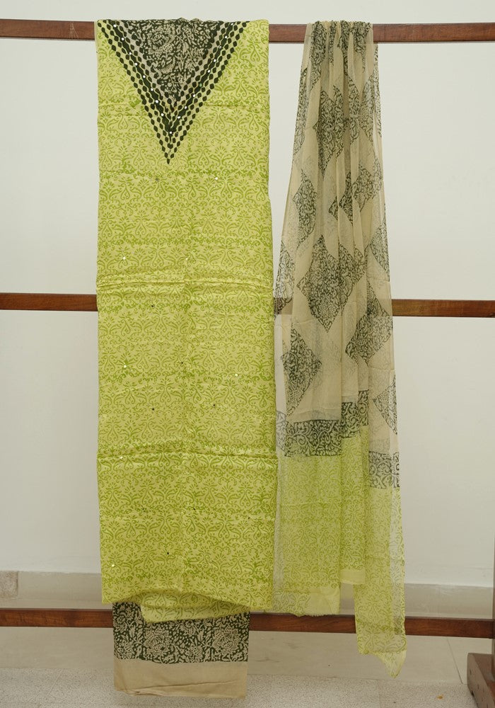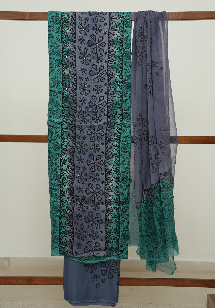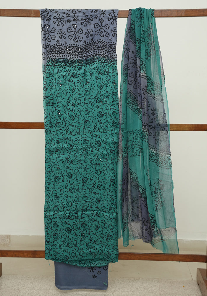 Green and Grey Modal Block Printed Unstitched Salwar Set With Mirror and Badla Work