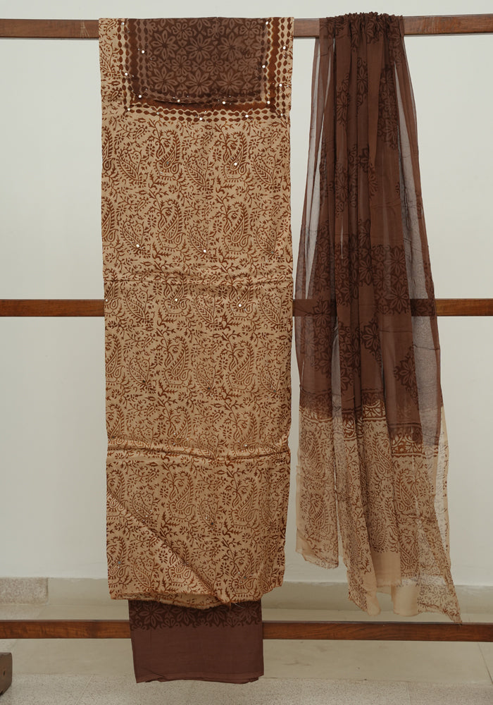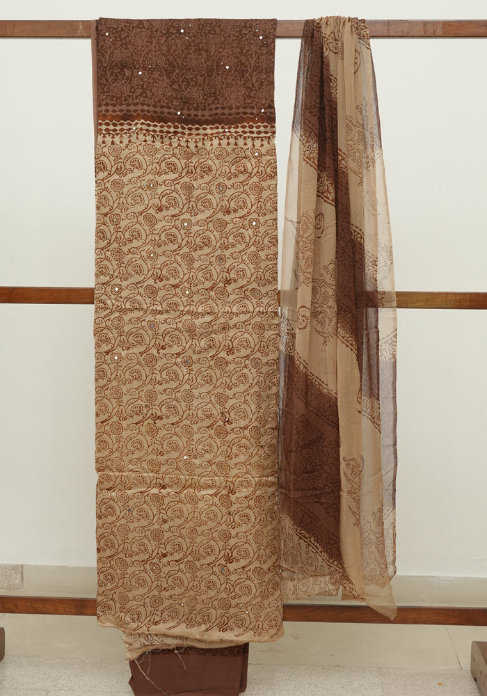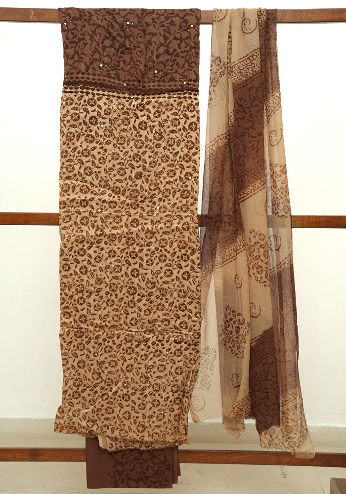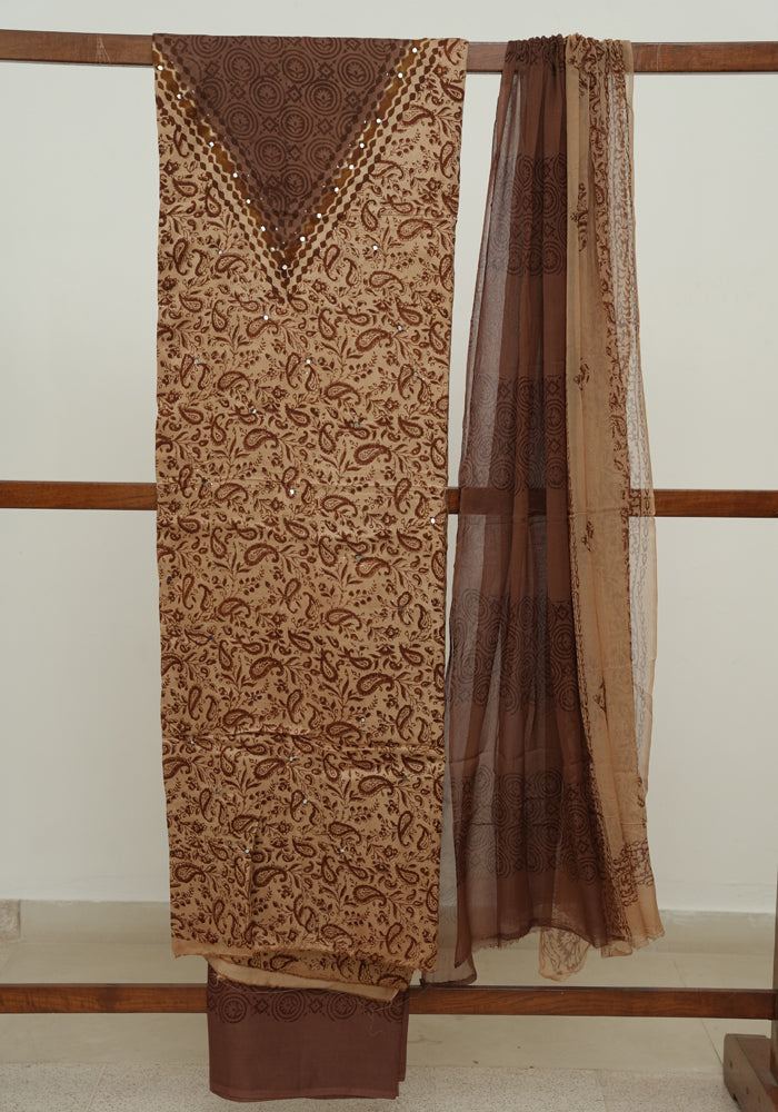 Light Brown and Brown Modal Block Printed Unstitched Salwar Set With Mirror and Badla Work