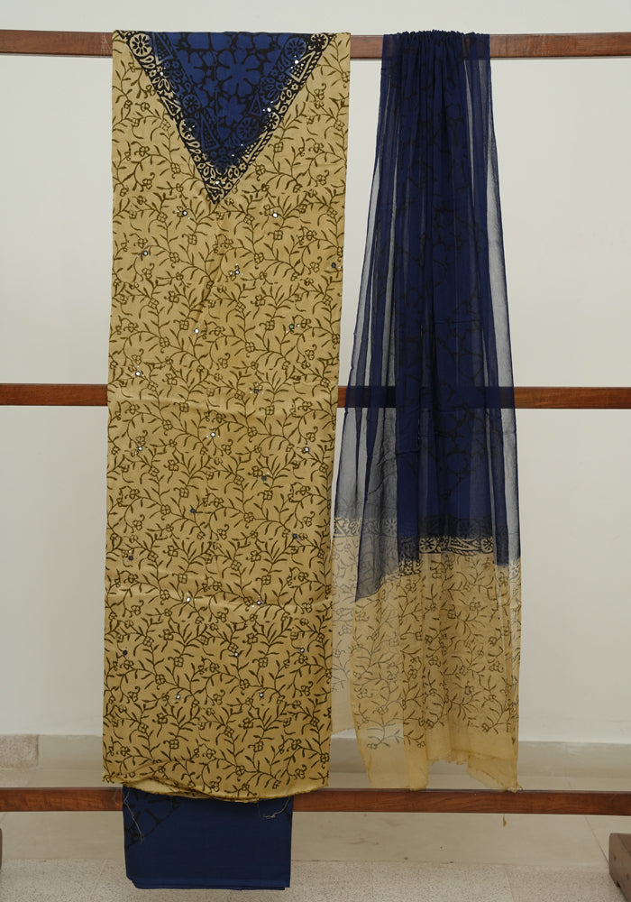 Light Brown and Dark Blue Modal Silk Block Printed Unstitched Salwar Set With Mirror and Badla Work