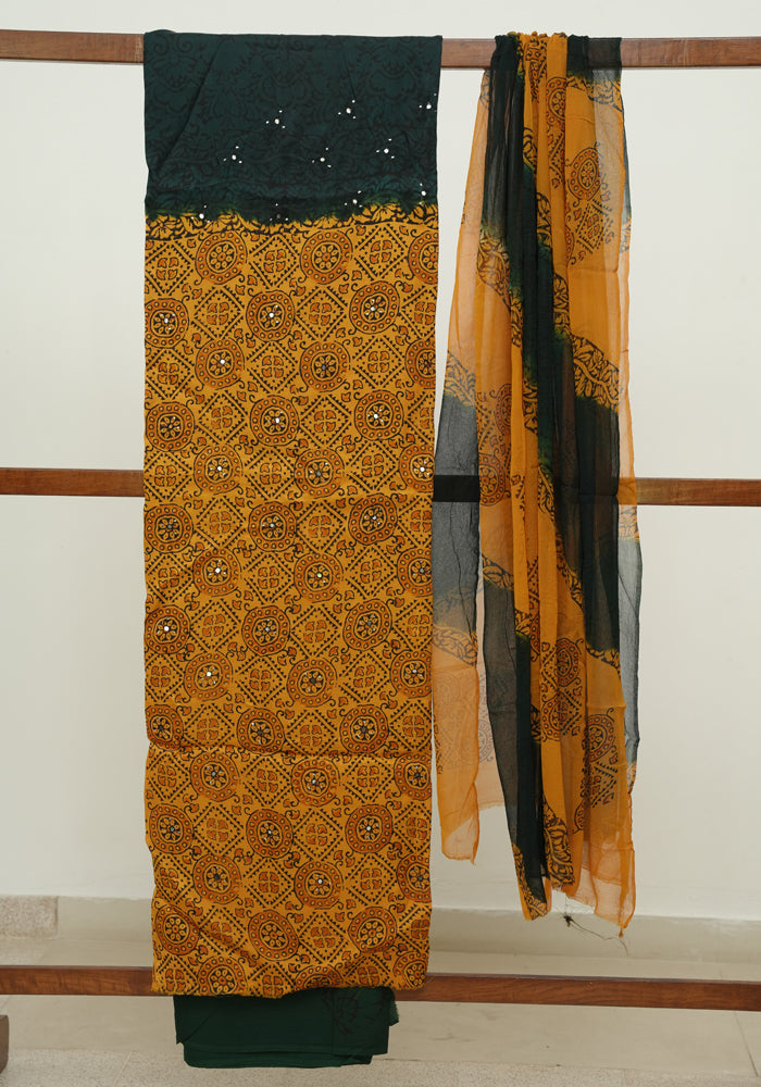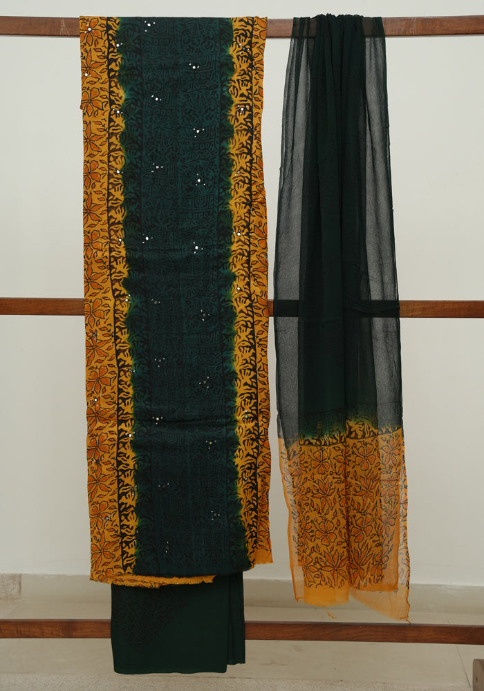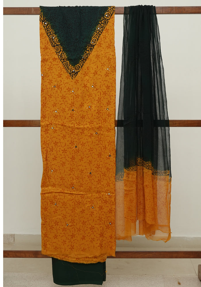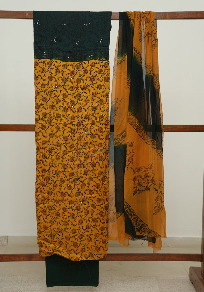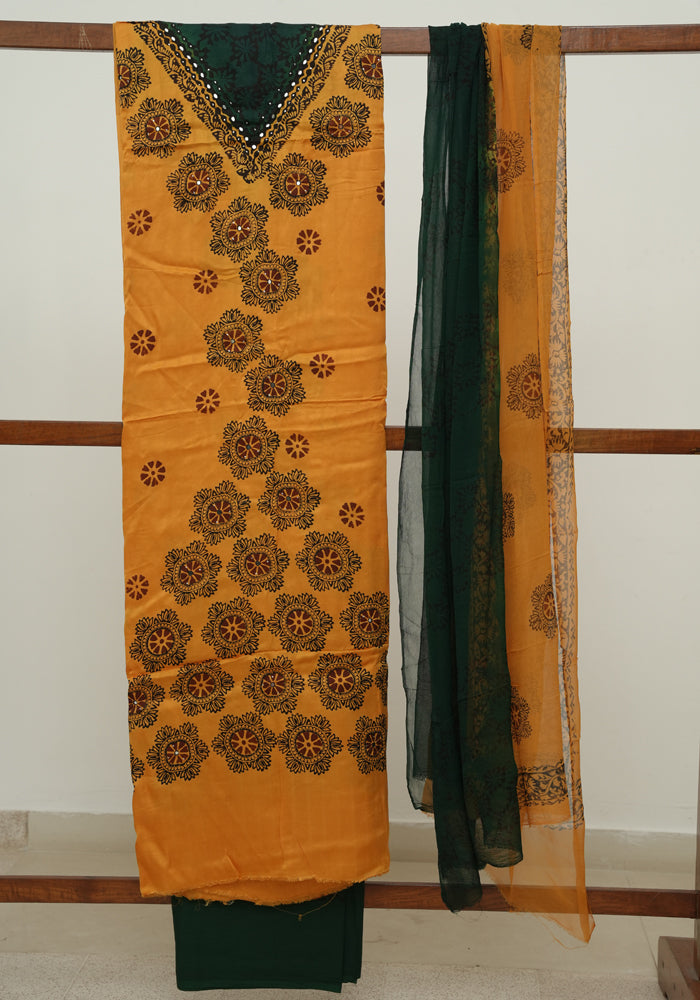 Mango Yellow and Dark Green Modal Silk Block Printed Unstitched Salwar Set With Mirror and Badla Work