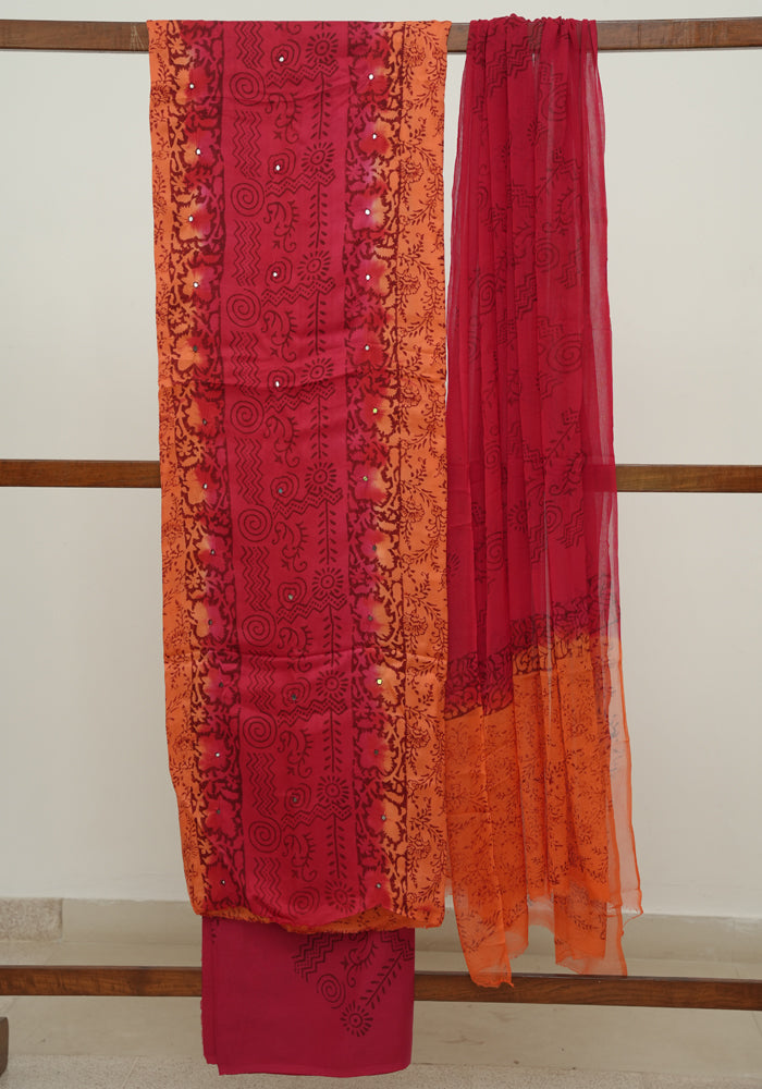Orange and Red Modal Block Printed Unstitched Salwar Set With Mirror and Badla Work