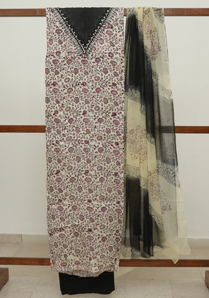 Beige and Black Modal Silk Block Printed Unstitched Salwar Set With Mirror and Badla Work