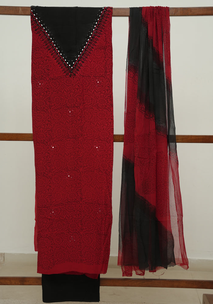 Red and Black Modal Silk Block Printed Unstitched Salwar Set With Mirror and Badla Work