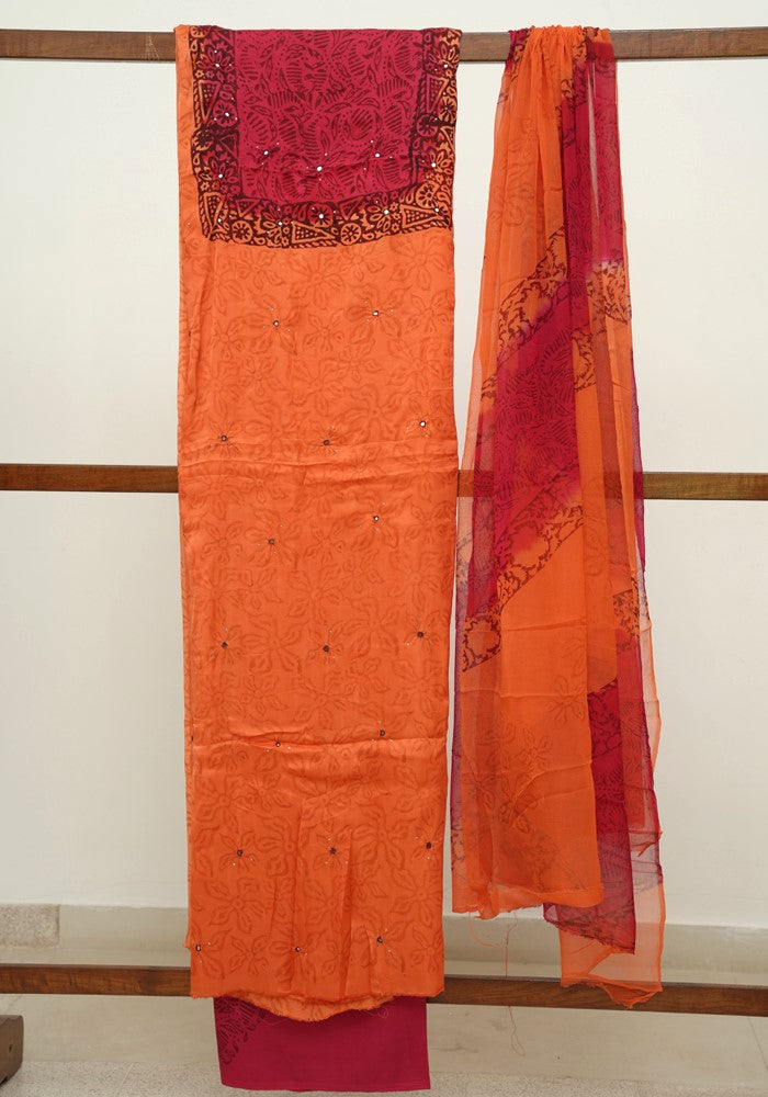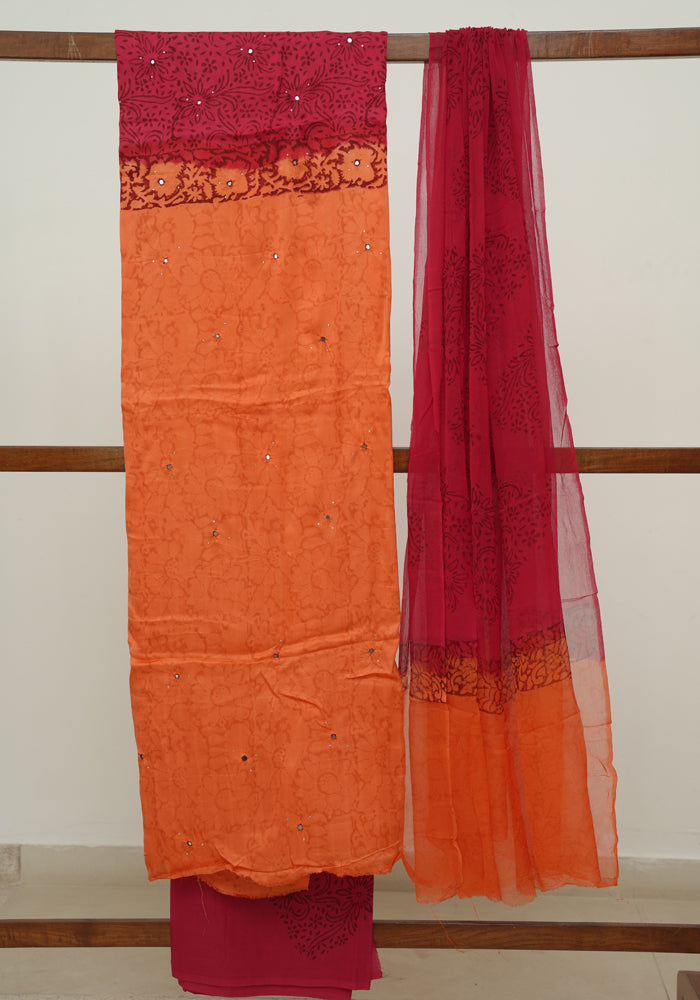 Orange and Red Modal Silk Block Printed Unstitched Salwar Set With Mirror and Badla Work