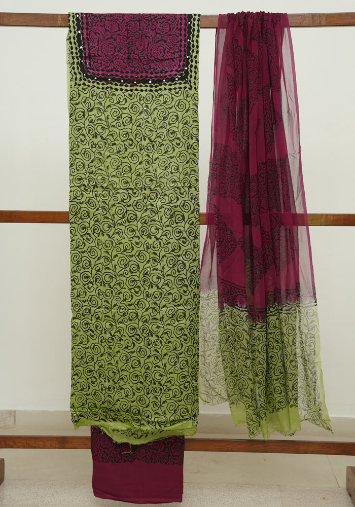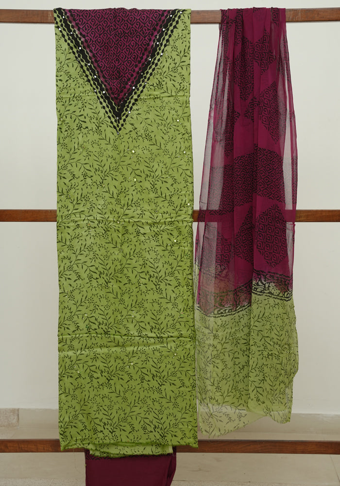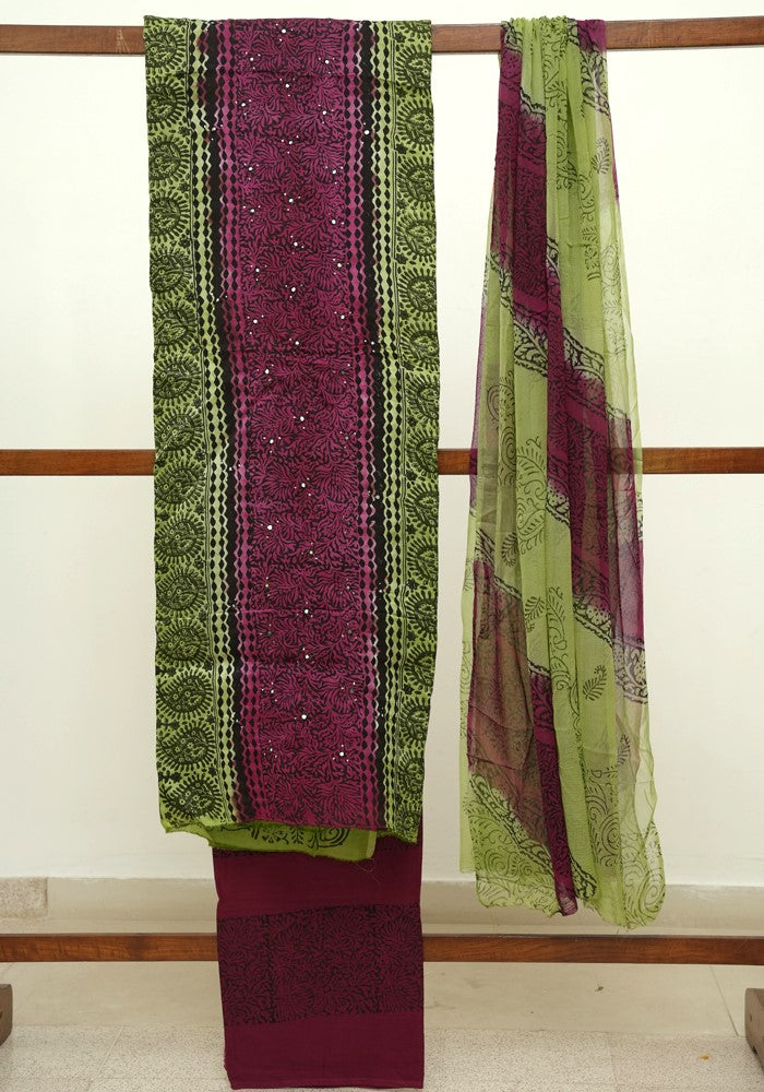 Green and Jamun Red Modal Block Printed Unstitched Salwar Set With Mirror and Badla Work