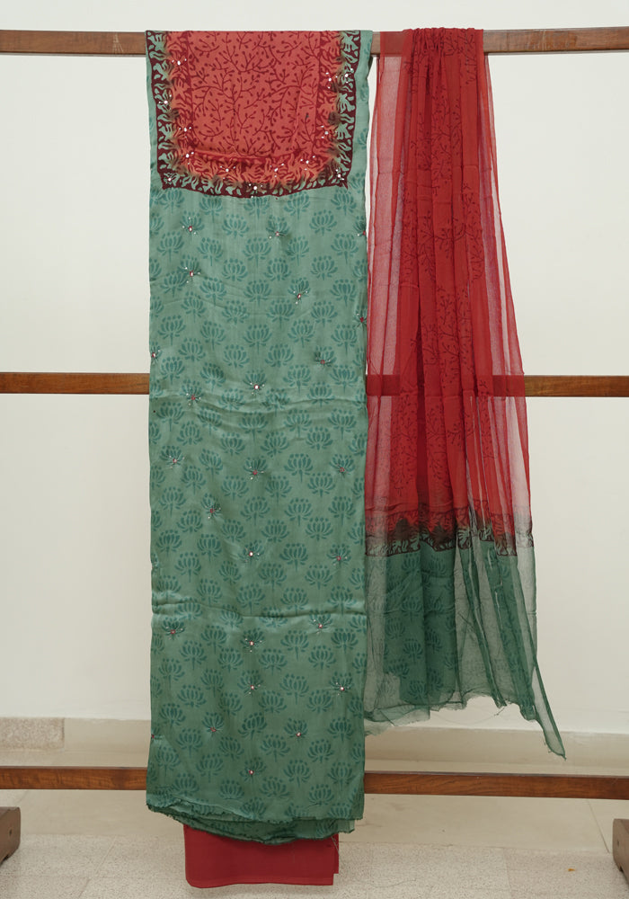Teal Green and Rust Red Modal Silk Block Printed Unstitched Salwar Set With Mirror and Badla Work
