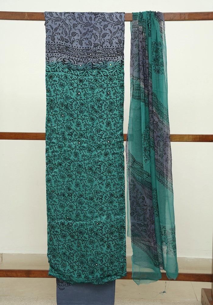 Green and Grey Modal Silk Block Printed Unstitched Salwar Set With Mirror and Badla Work