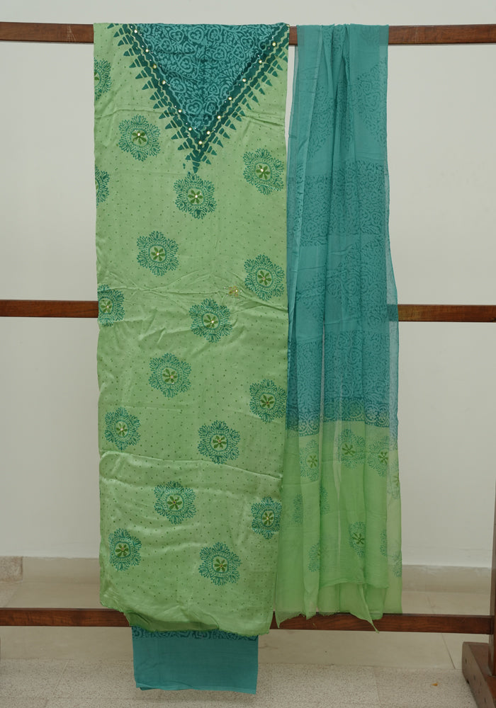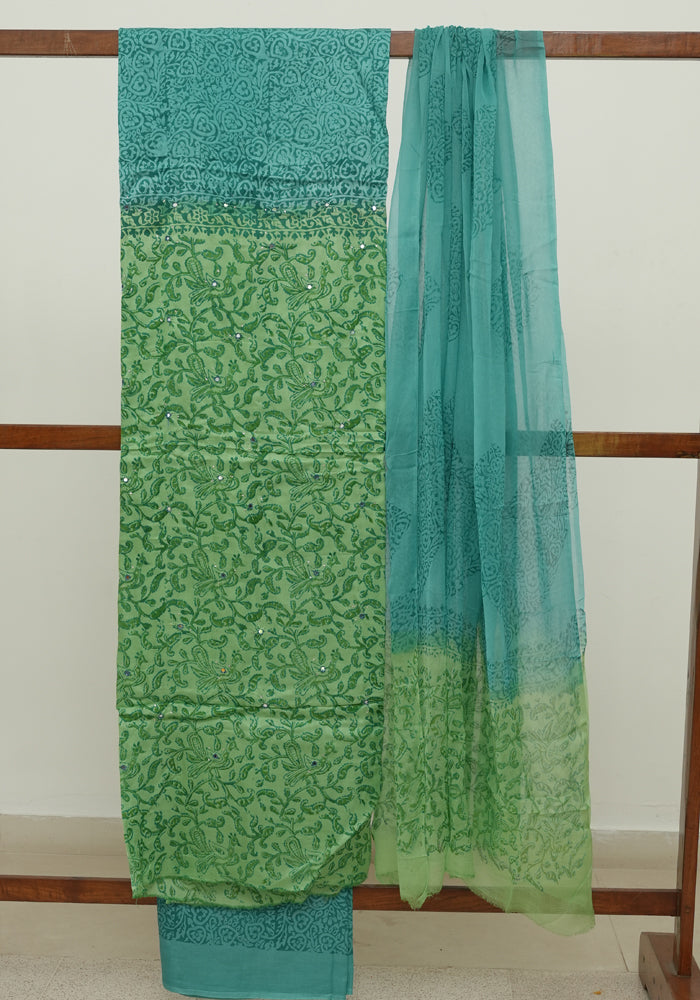 Parrot Green and Sea Green Modal Block Printed Unstitched Salwar Set With Mirror and Badla Work
