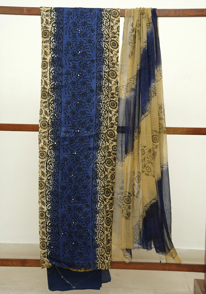 Cobalt Blue and Blue Modal Block Printed Unstitched Salwar Set With Mirror and Badla Work