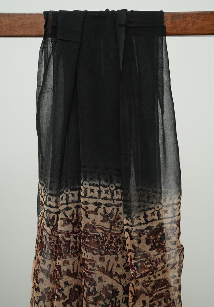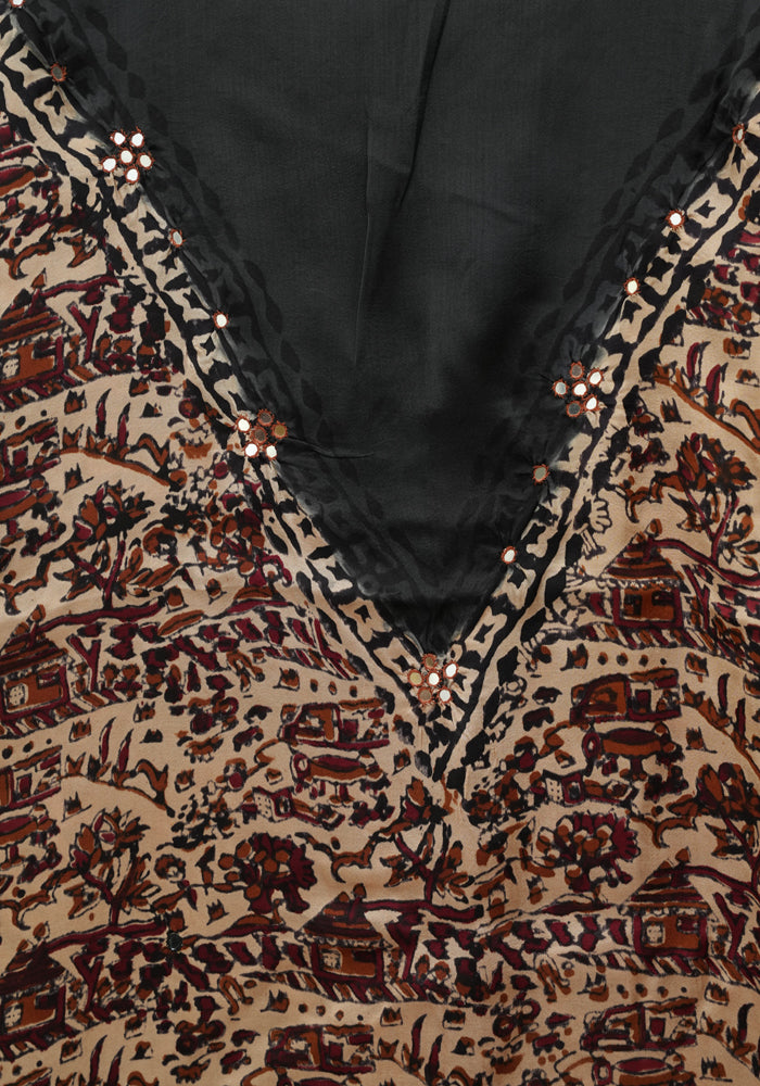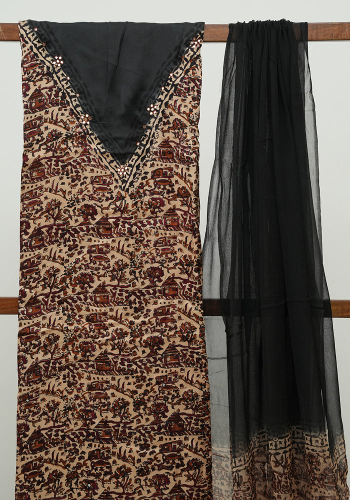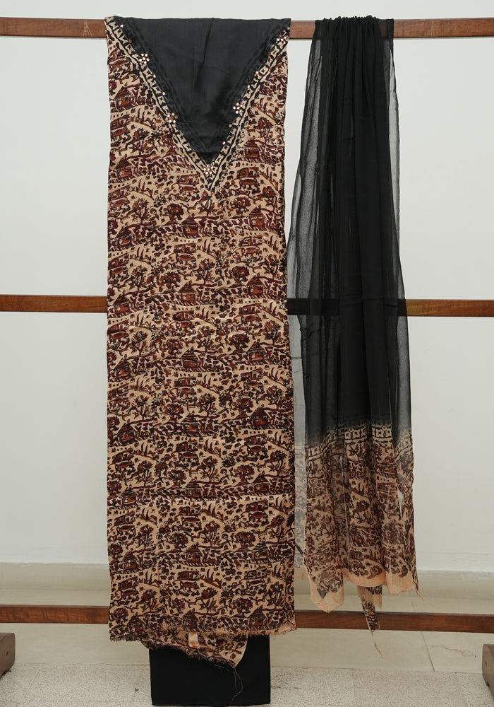 Light Brown and Black Modal Silk Kalamkari Block Printed Unstitched Salwar Set With Mirror Work