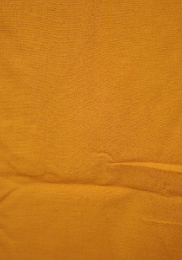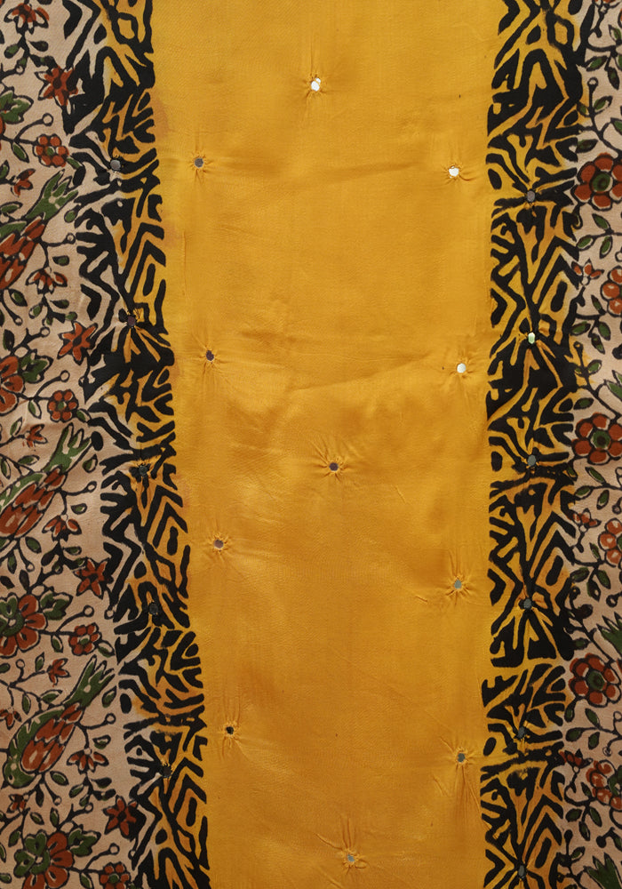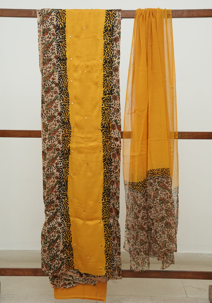 Light Brown and Mango Yellow Modal Silk Kalamkari Block Printed Unstitched Salwar Set With Mirror Work