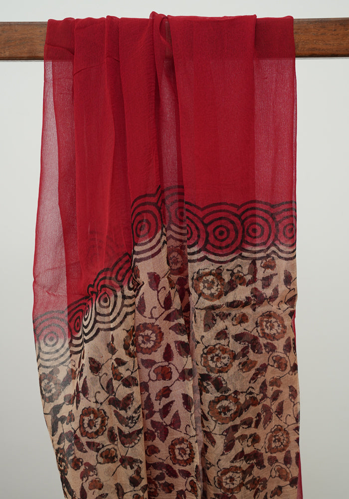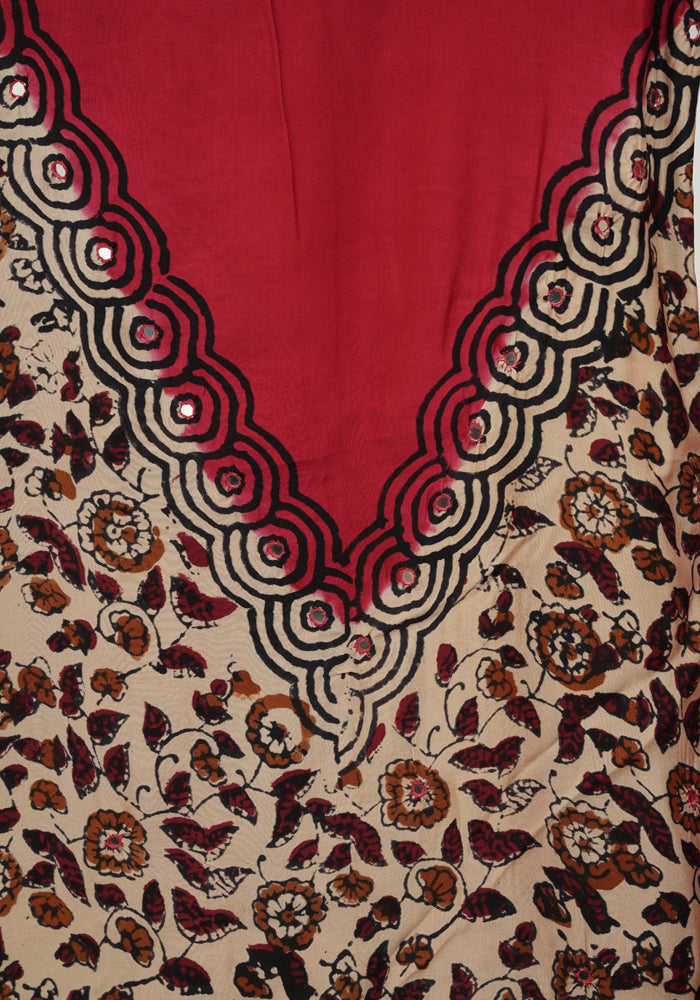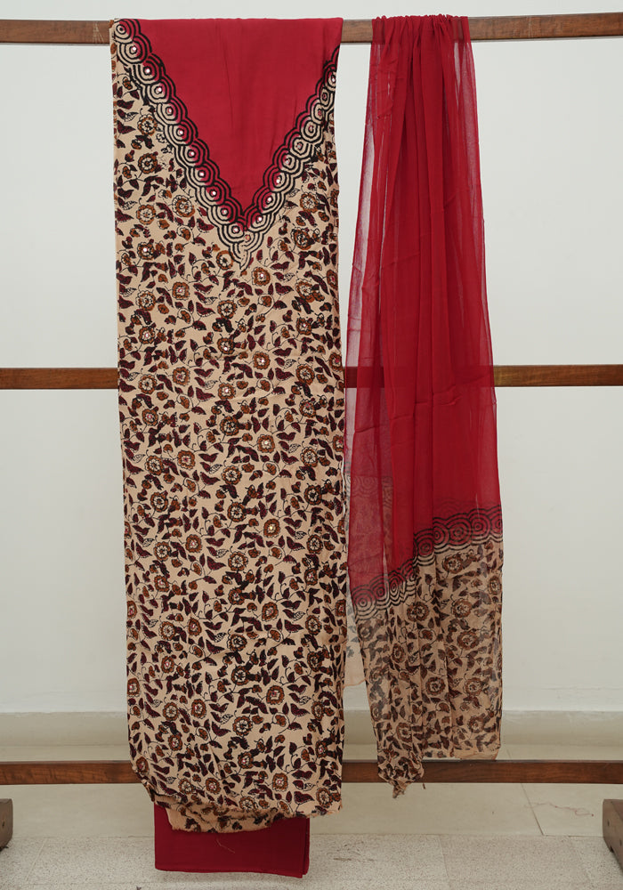 Light Brown and Red Modal Silk Kalamkari Block Printed Unstitched Salwar Set With Mirror Work