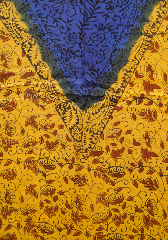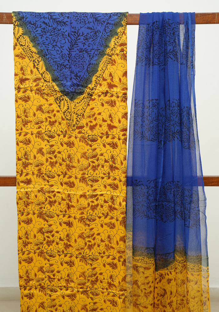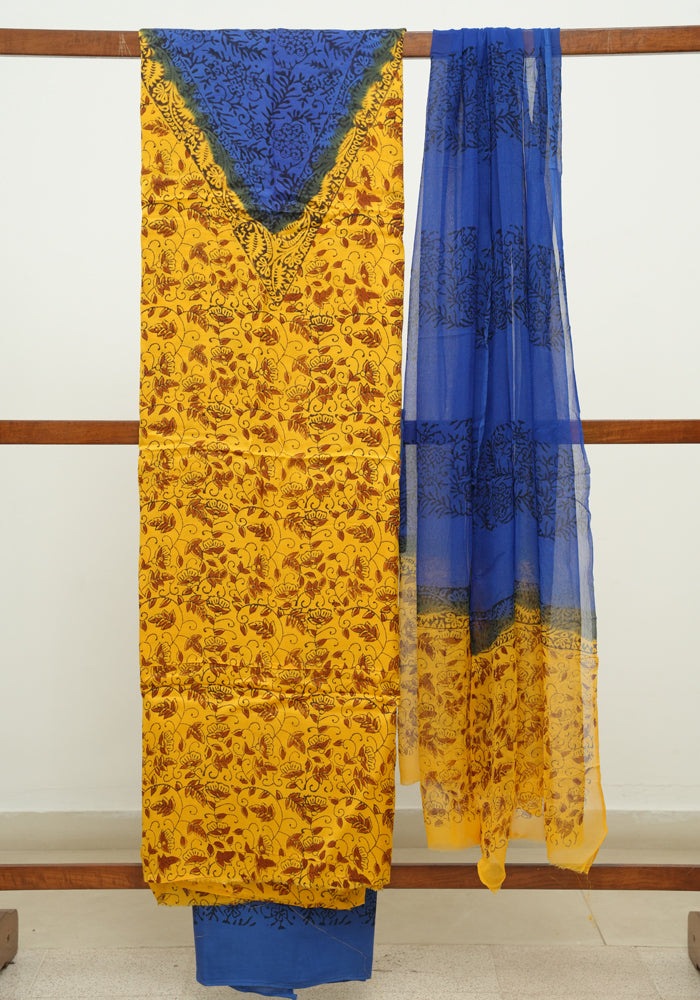 Mango Yellow and Blue Modal Silk Block Printed Unstitched Salwar Set