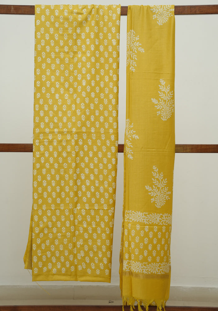 Yellow Unstitched Block Printed Muslin Salwar Set