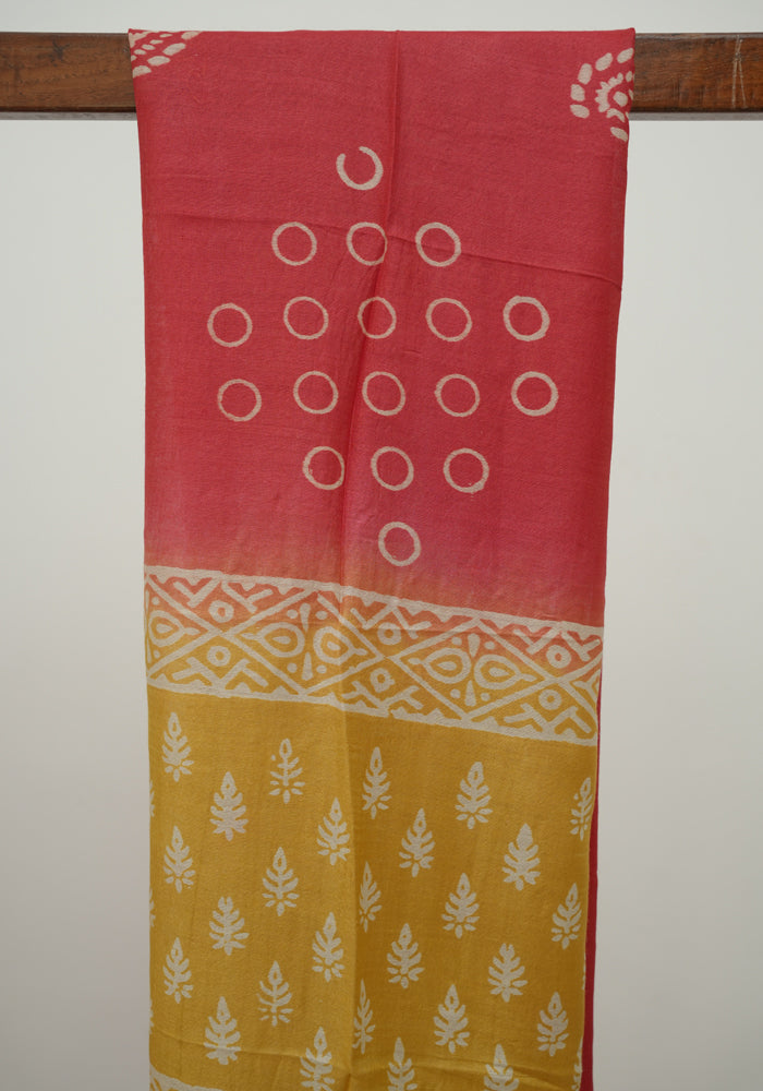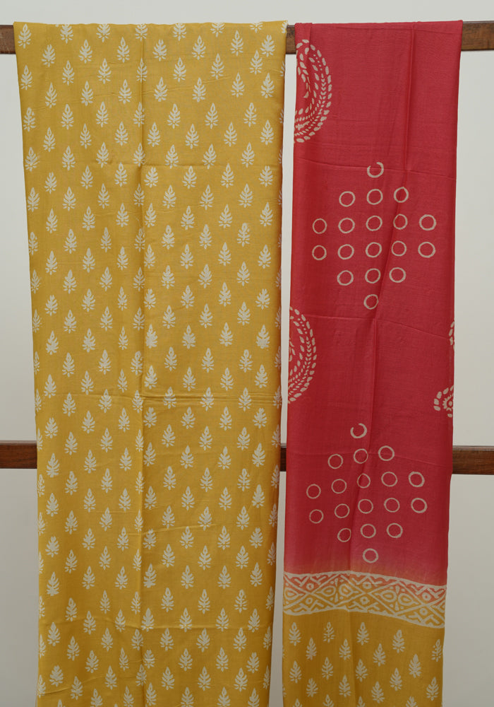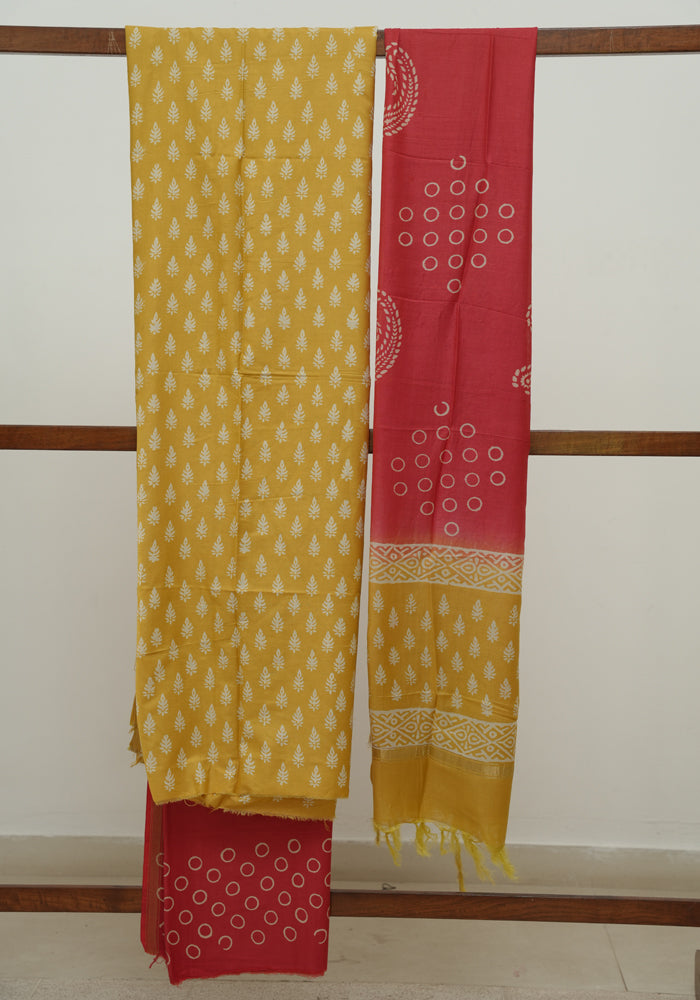 Yellow and Red Unstitched Block Printed Muslin Salwar Set