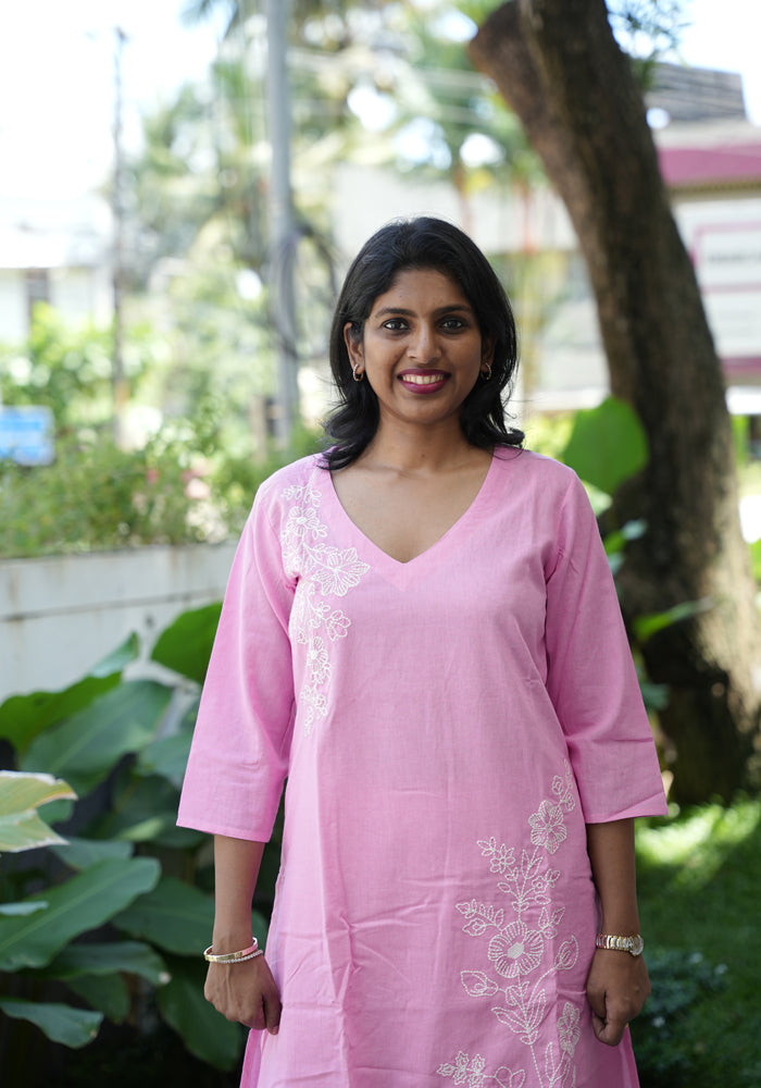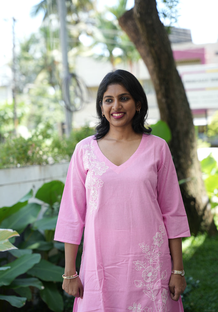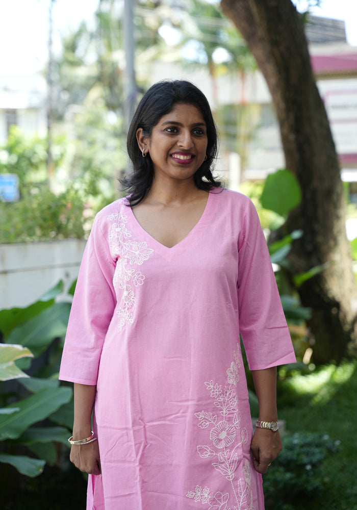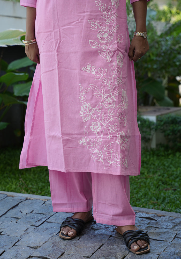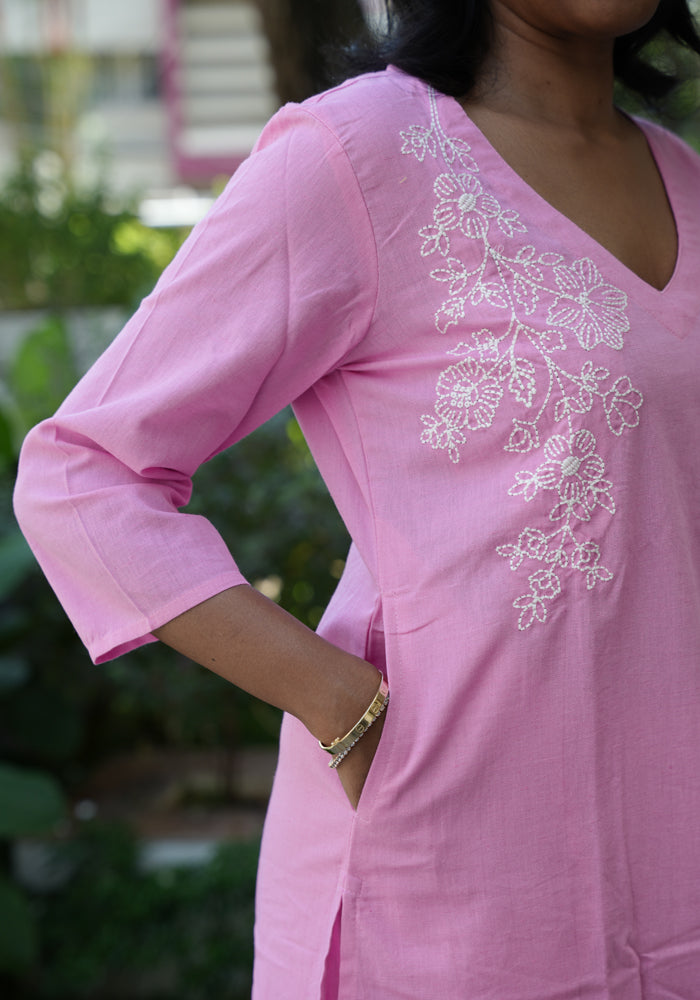 This pure cotton embroidered co-ord set is perfect for everyday wear. The top has embroidery and three fourth sleeves and the bottom is plain.