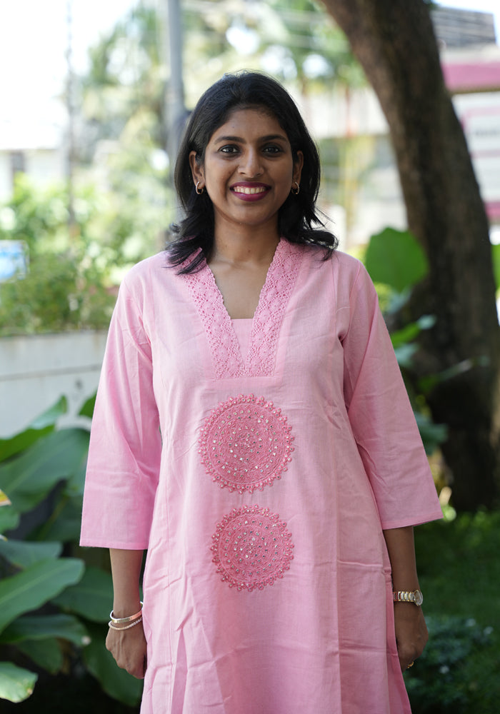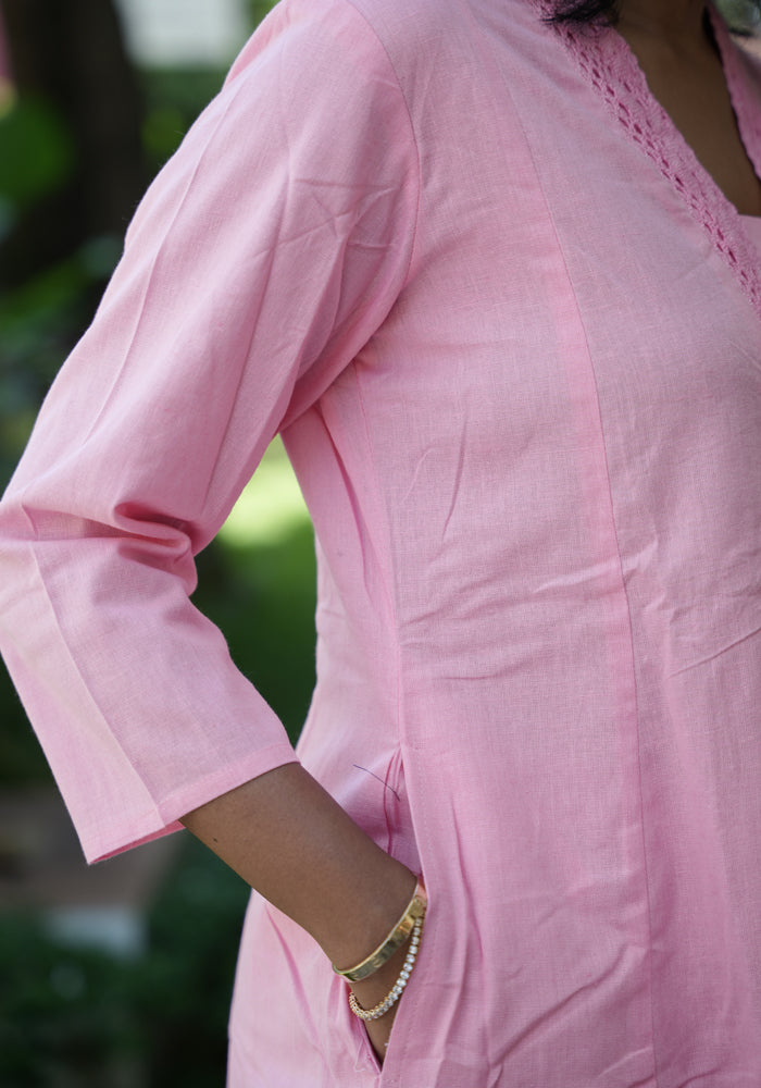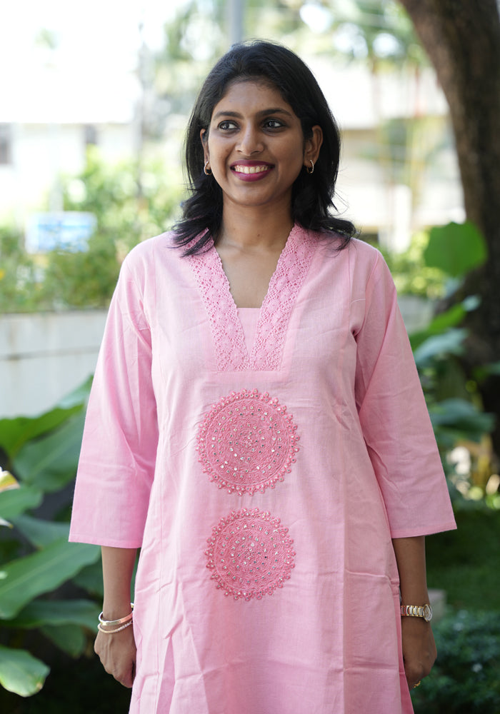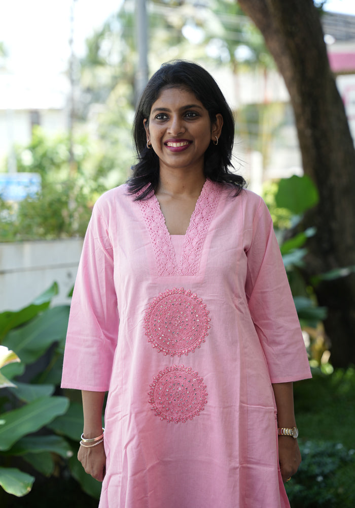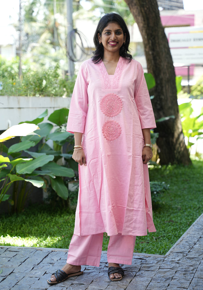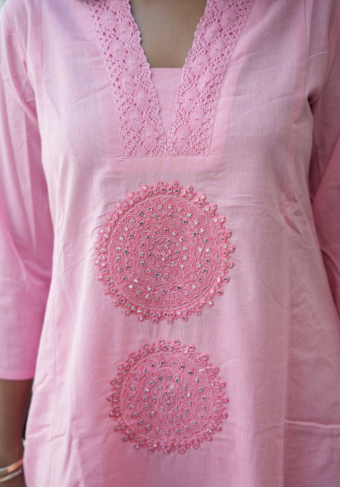 This pure cotton embroidered co-ord set is perfect for everyday wear. The top has embroidery and three fourth sleeves and the bottom is plain.