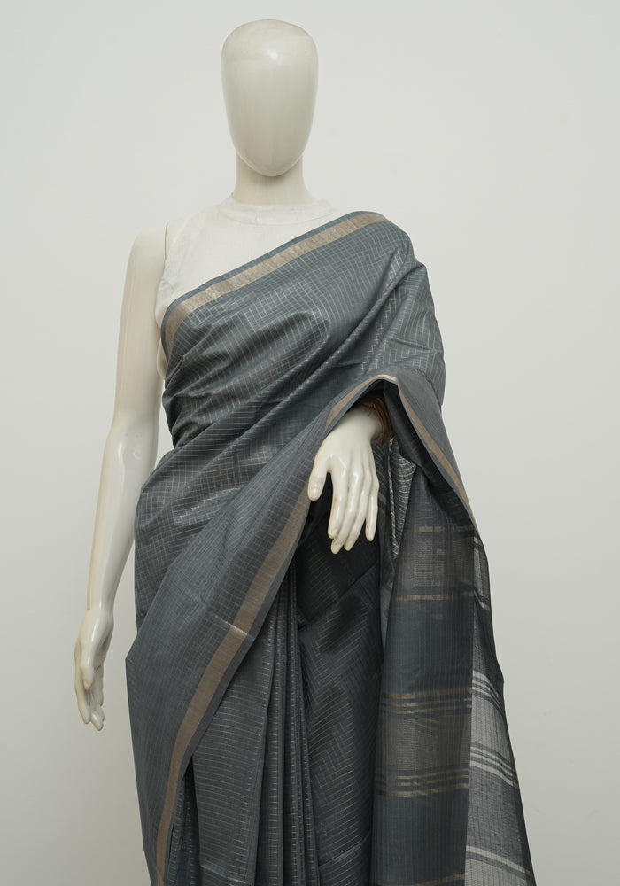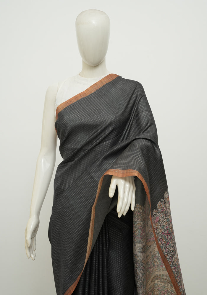 Dark Grey Moonga Semi Tussar Saree With Printed Kalamkari Blouse