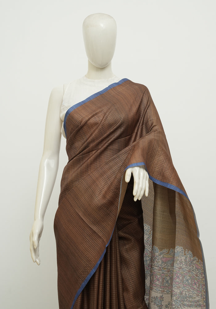 Brown and Blue Madhubani Printed Semi Tussar Saree