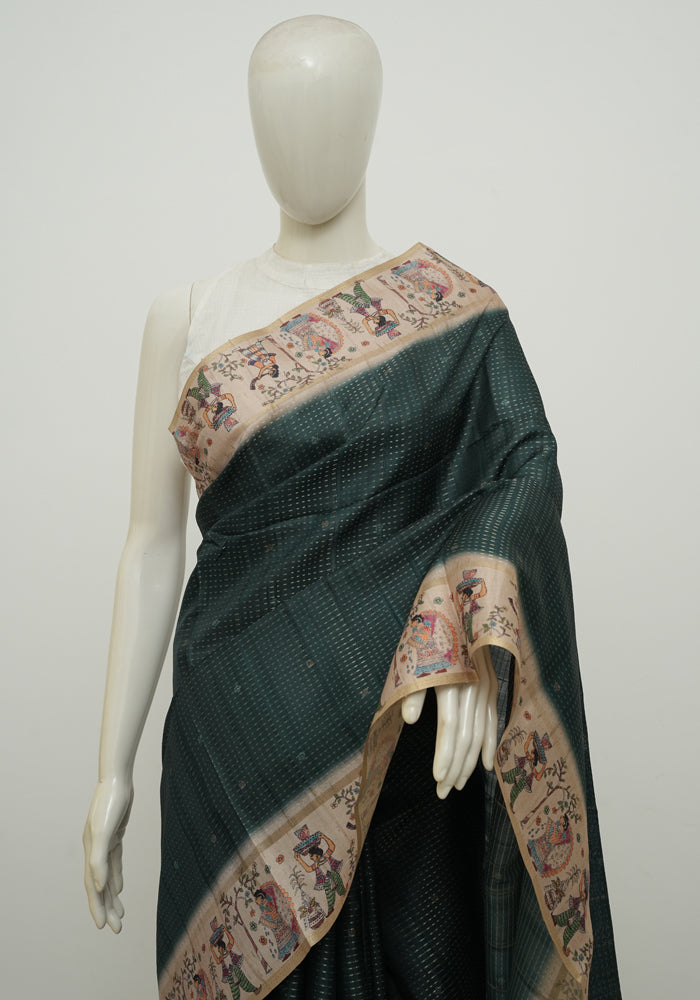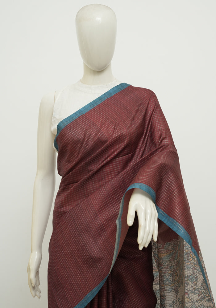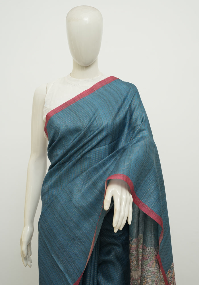 Maroon and Teal Blue Madhubani Printed Semi Tussar Saree