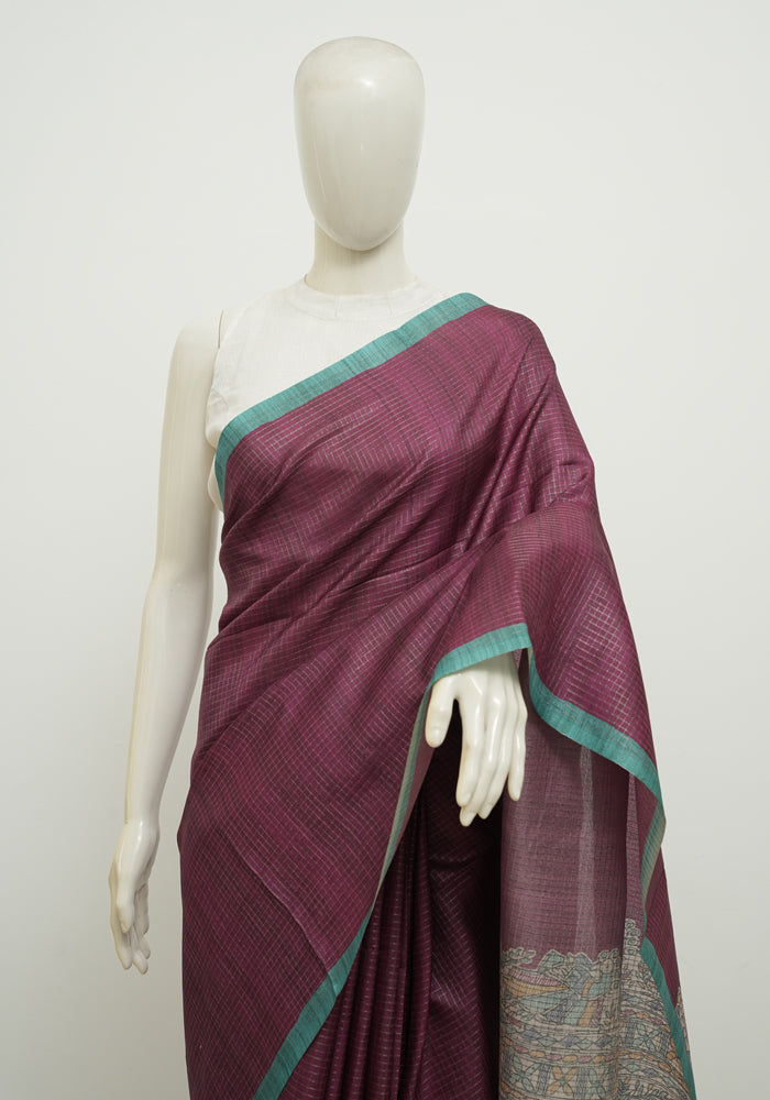 Purple and Green Madhubani Printed Semi Tussar Saree