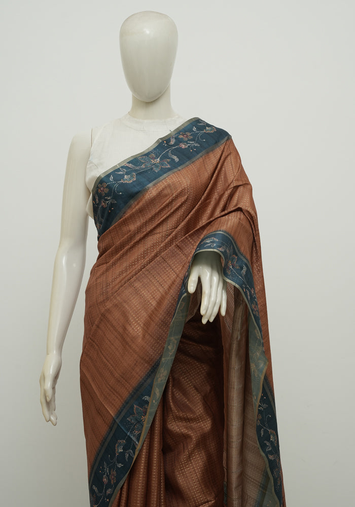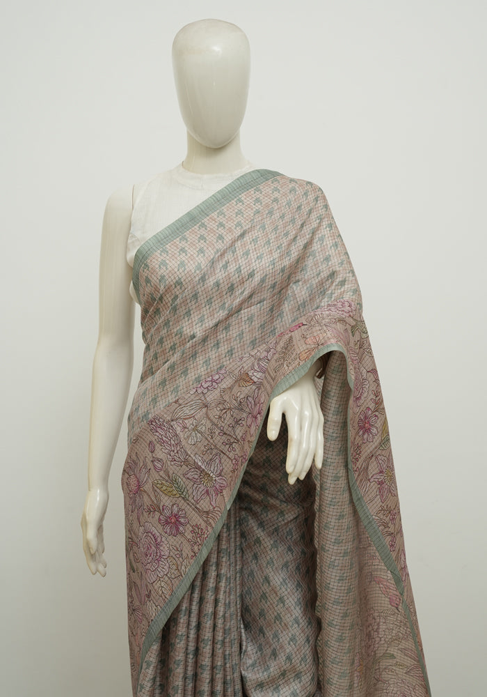 Light Brown Moonga Semi Tussar Saree With Printed Kalamkari Blouse