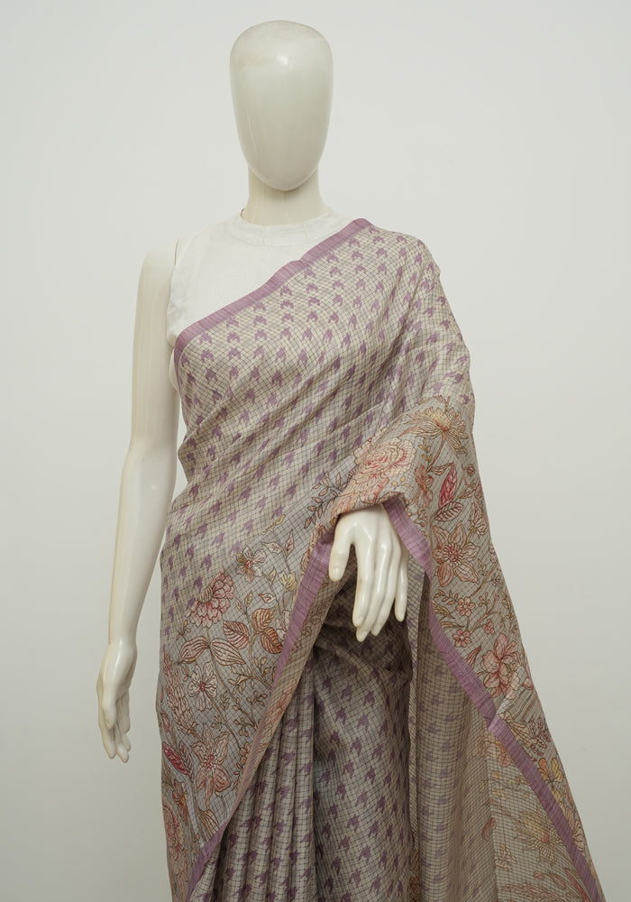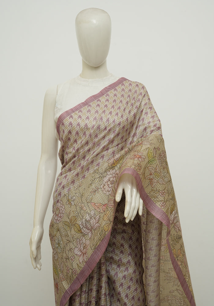 Beige and Lavender Printed Semi Tussar Saree