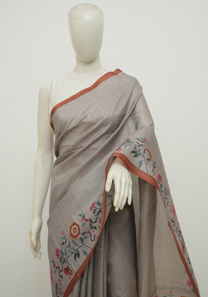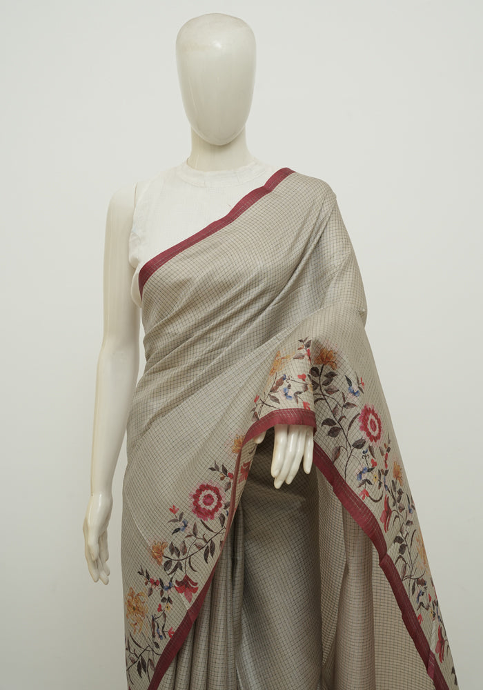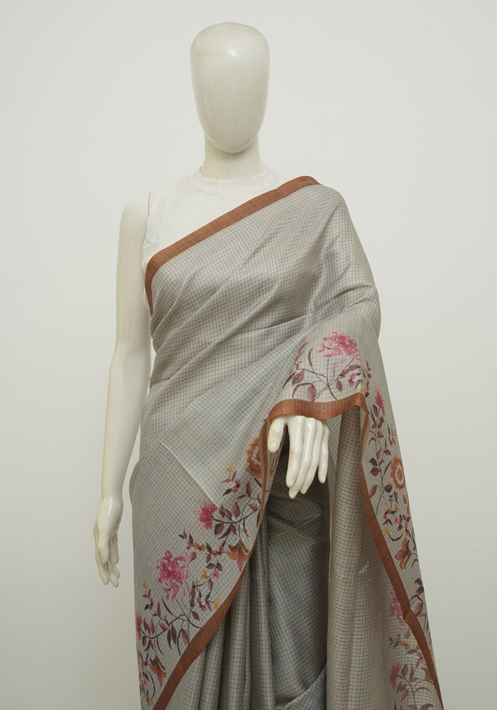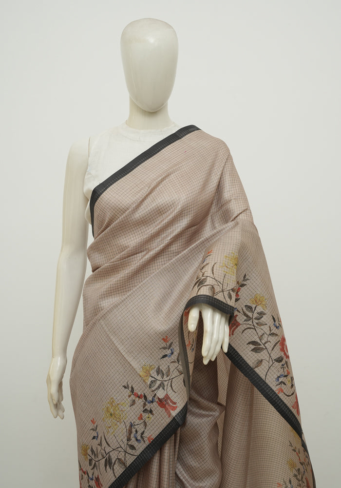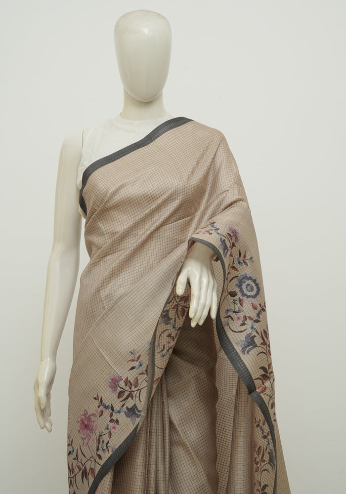 Beige and Light Brown Printed Semi Tussar Saree