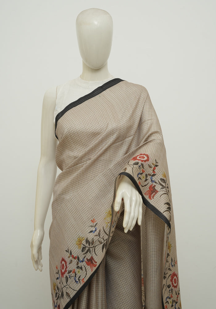 Beige and Black Semi Tussar Saree With Digital Print