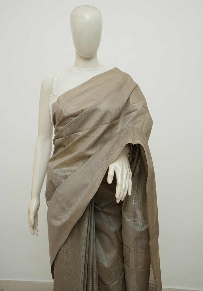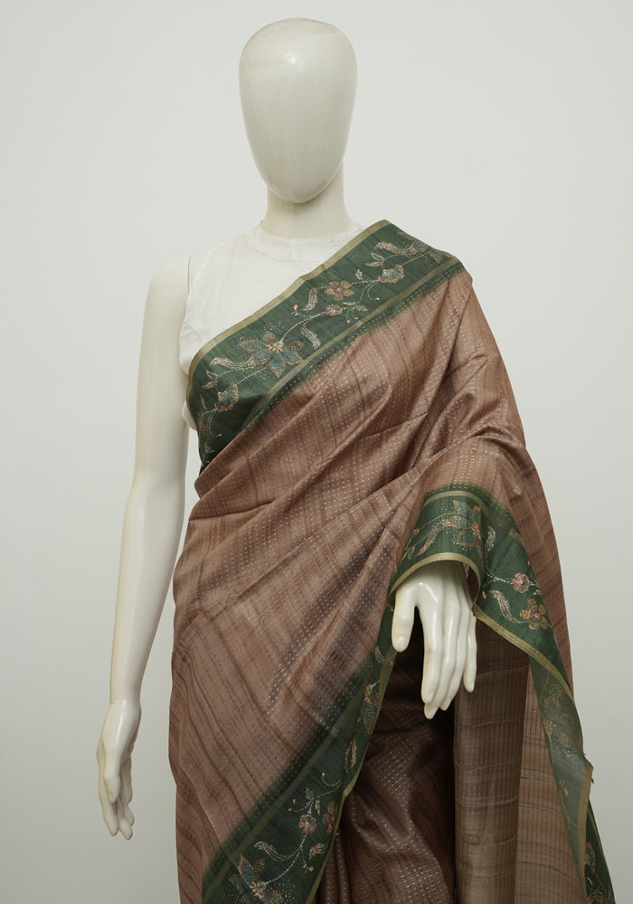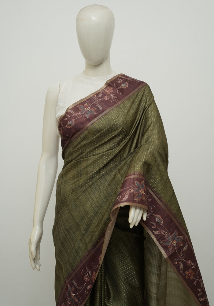 Olive Green and Brown Semi Tussar Saree with Kanta Printed Pallu and Blouse