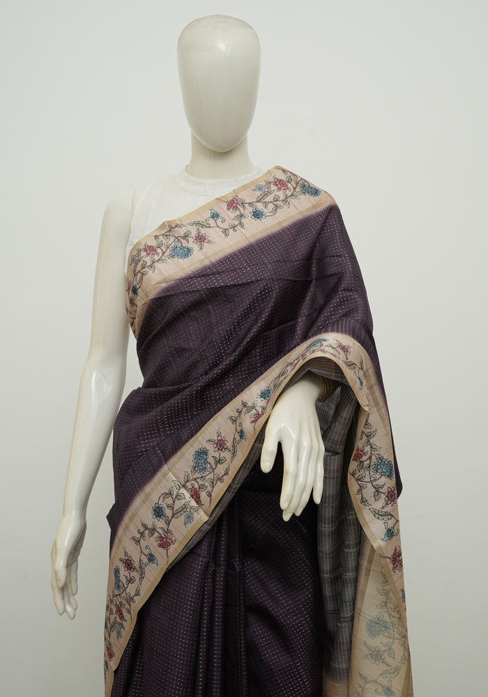 Purple Moonga Semi Tussar Saree With Printed Kalamkari Blouse