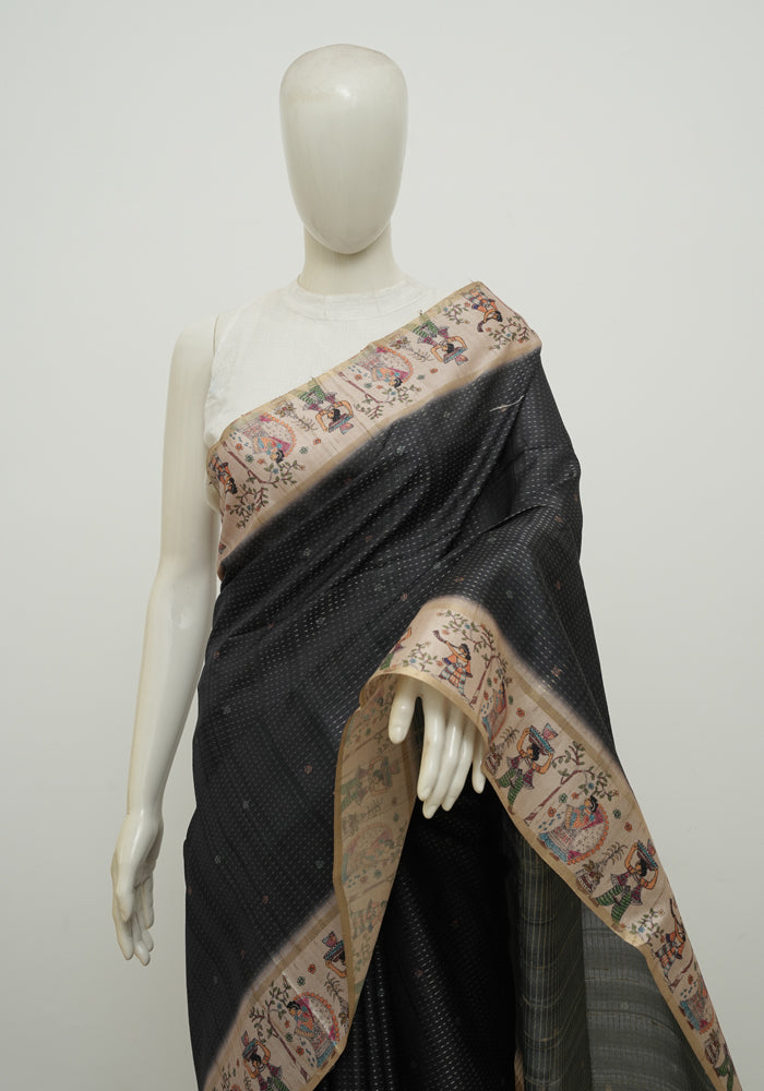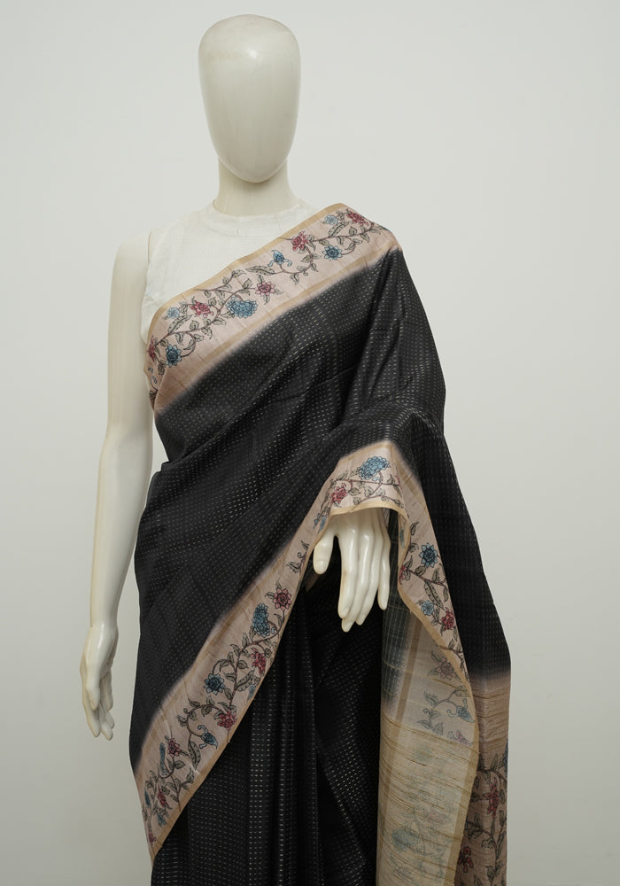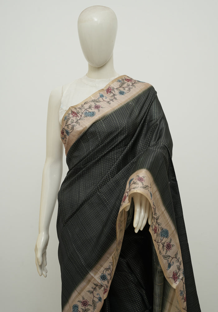 Black and Beige Semi Tussar Saree with Kanta Printed Pallu and Blouse