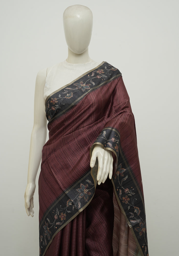 Maroon and Black Semi Tussar Saree with Kanta Printed Pallu and Blouse