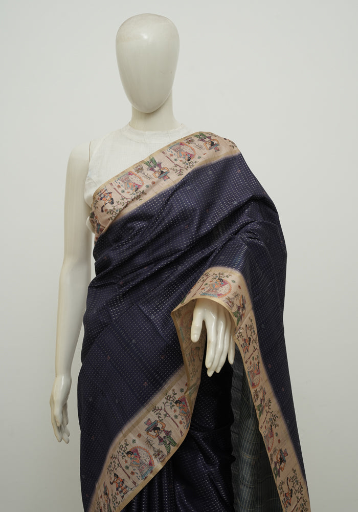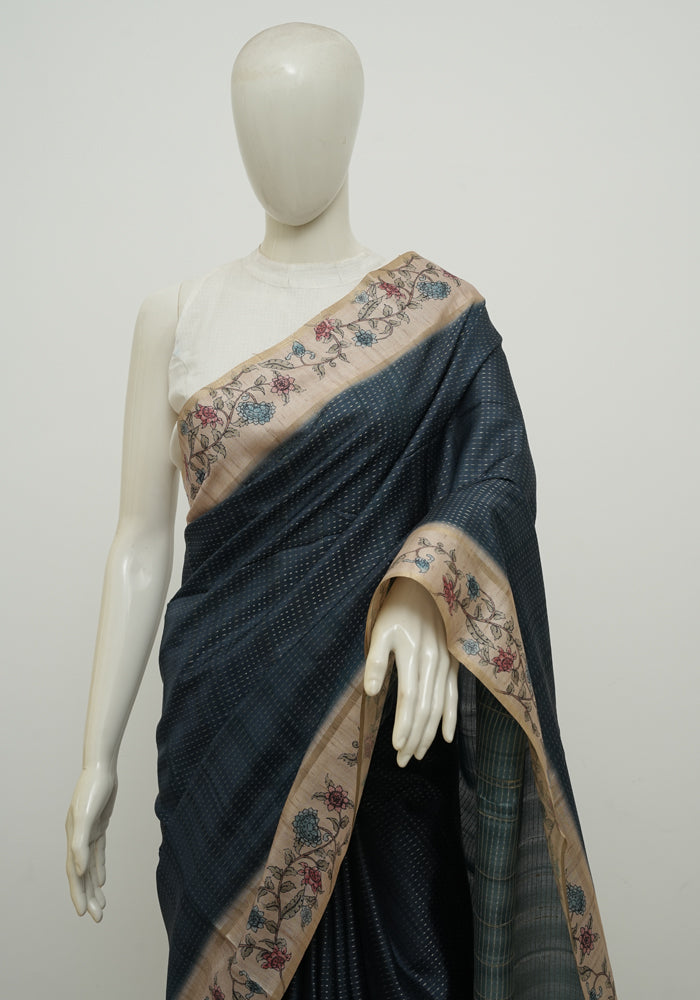 Navy Blue and Beige Semi Tussar Saree with Kanta Printed Pallu and Blouse